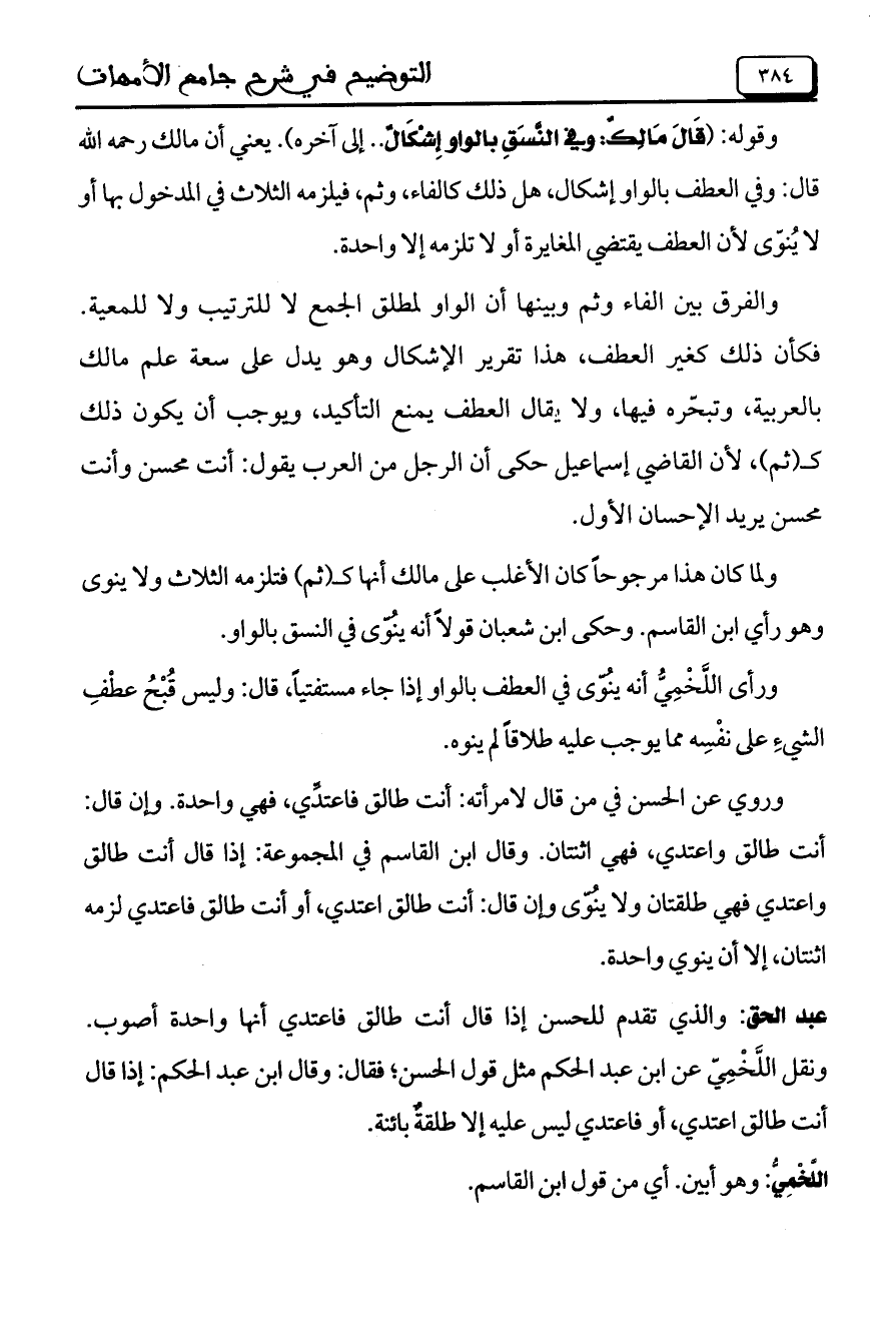 ورأى اللخمي أنه ينوي في العطف بالواو إذا جاء مستفتياً، قال: وليس قبح عطف الشيء على نفسه مما يوجب عليه طلاقاً لم ينوه.