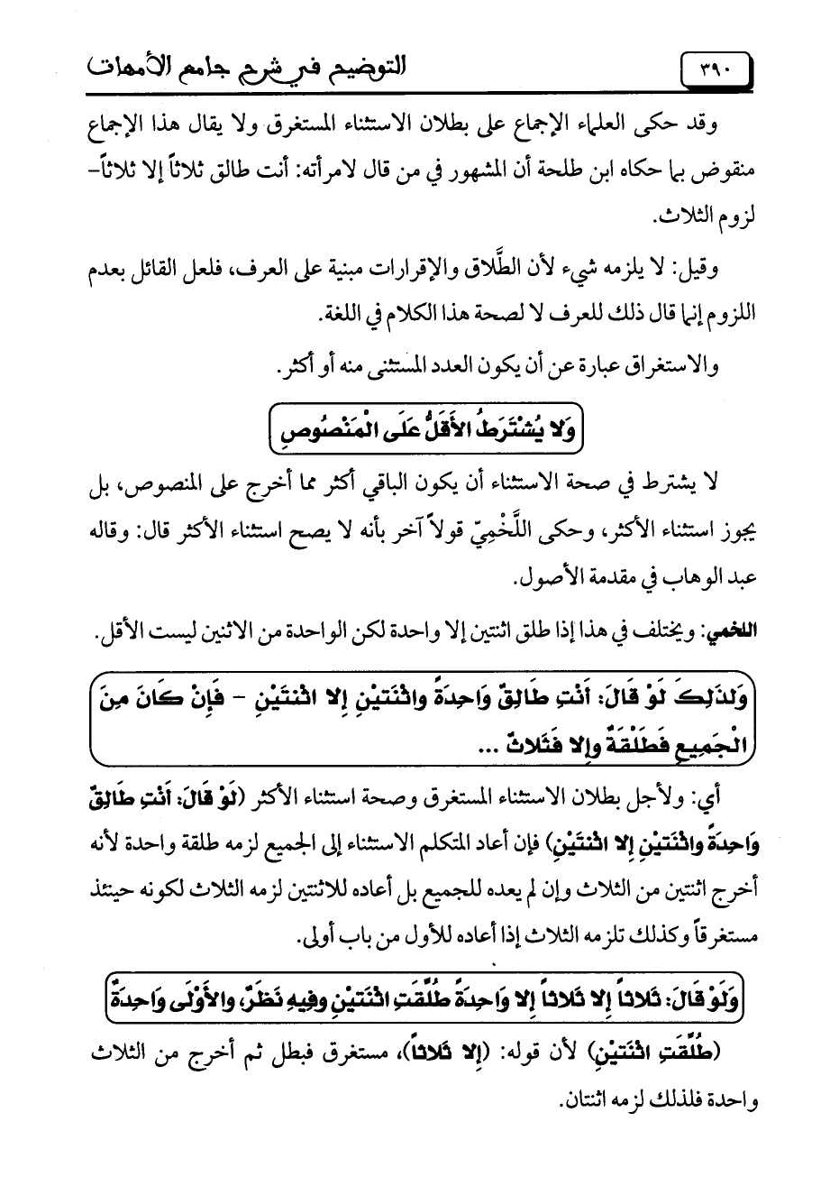 وقد حكى العلماء الإجماع على بطلان الاستثناء المستغرق ولا يقال هذا الإجماع منقوض بما حكاه ابن طلحة أن المشهور في من قال لامرأته: أنت طالق ثلاثاً إلا ثلاثاً- لزوم الثلاث.