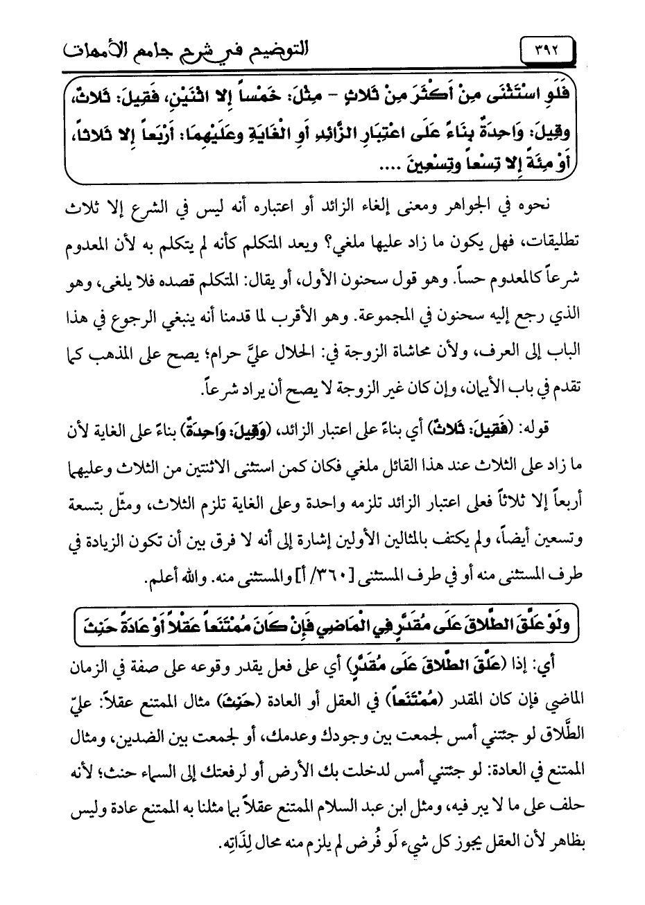 نحوه في الجواهر ومعنى إلغاء الزائد أو اعتباره أنه ليس في الشرع إلا ثلاث تطليقات، فهل يكون ما زاد عليها ملغي؟ ويعد المتكلم كأنه لم يتكلم به لأن المعدوم شرعاً كالمعدوم حساً. وهو قول سحنون الأول، أو يقال: المتكلم قصده فلا يلغى، وهو الذي رجع إليه سحنون في المجموعة. وهو الأقرب لما قدمنا أنه ينبغي الرجوع في هذا الباب إلى العرف، ولأن محاشاة الزوجة في: الحلال علي حرام؛ يصح على المذهب كما تقدم في باب الأيمان، وإن كان غير الزوجة لا يصح أن يراد شرعاً.