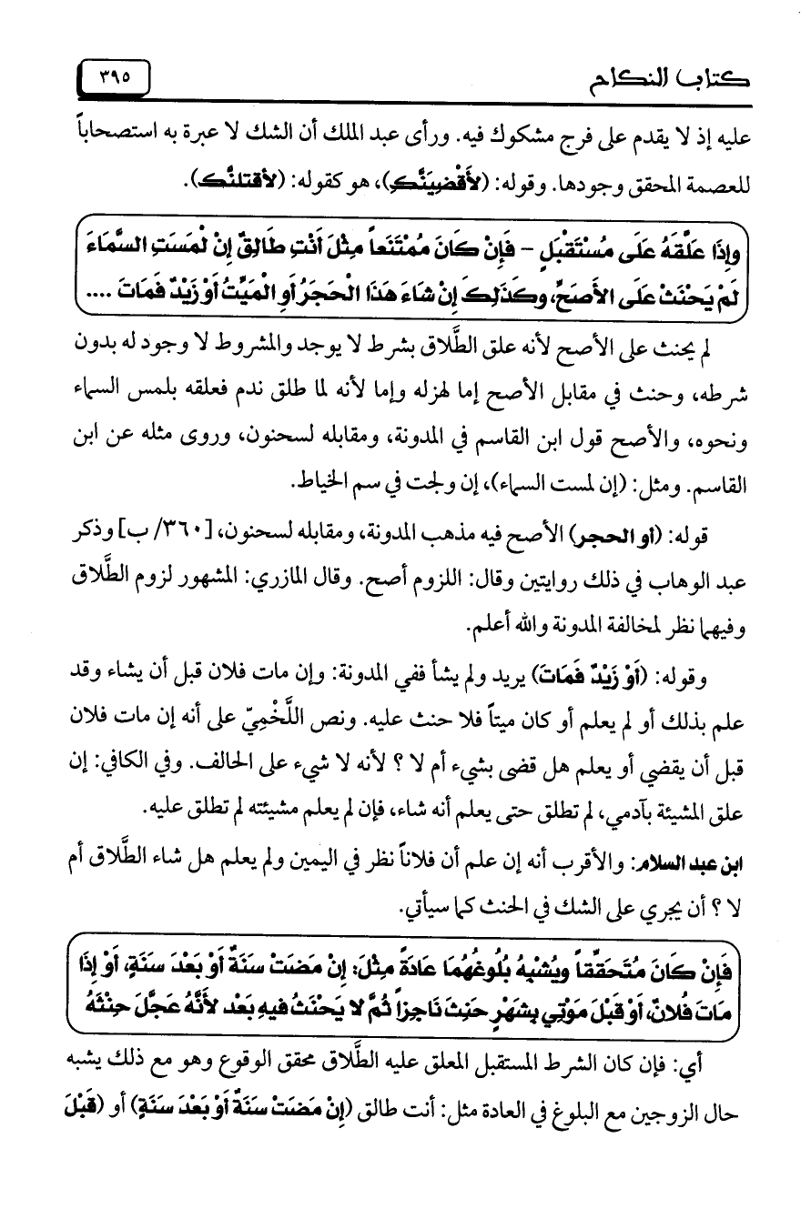 ابن عبد السلام: والأقرب أنه إن علم أن فلاناً نظر في اليمين ولم يعلم هل شاء الطلاق أم لا؟ أن يجري على الشك في الحنث كما سيأتي.