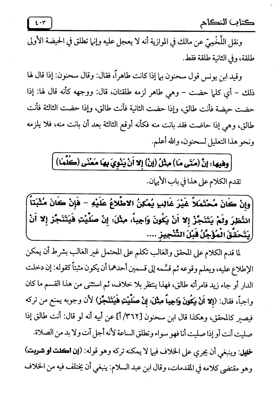 وقيد ابن يونس قول سحنون بما إذا كانت طاهراً، فقال: وقال سحنون: إذا قال لها ذلك- أي كلما حضت- وهي طاهر لزمه طلقتان، قال: ووجهه كأنه قال لها: إذا حضت حيضة فأنت طالق، وإذا حضت الثانية فأنت طالق، وإذا حضت الثالثة فأنت طالق، وهي إذا حاضت فقد بانت منه فكأنه أوقع الثالثة بعد أن بانت منه، فلا يلزمه ونحو هذا التعليل لسحنون، والله أعلم.