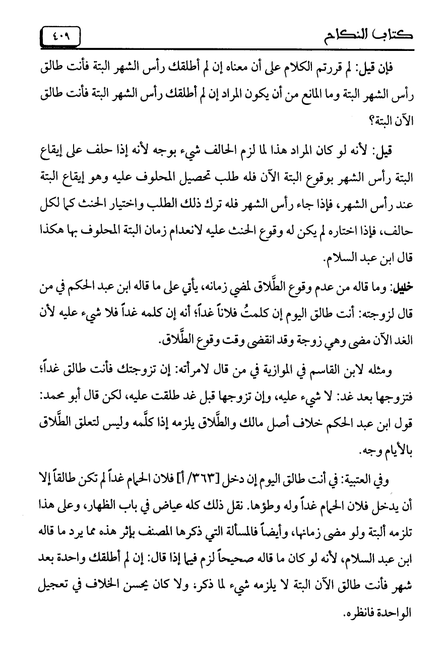 قيل: لأنه لو كان المراد هذا لما لزم الحالف شيء بوجه لأنه إذا حلف على إيقاع البتة رأس الشهر بوقوع البتة الآن فله طلب تحصيل المحلوف عليه وهو إيقاع البتة عند رأس الشهر، فإذا جاء رأس الشهر فله ترك ذلك الطلب واختيار الحنث كما لكل حالف، فإاذ اختاره لم يكن له وقوع الحنث عليه لانعدام زمان البتة المحلوف بها هكذا قال ابن عبد السلام.