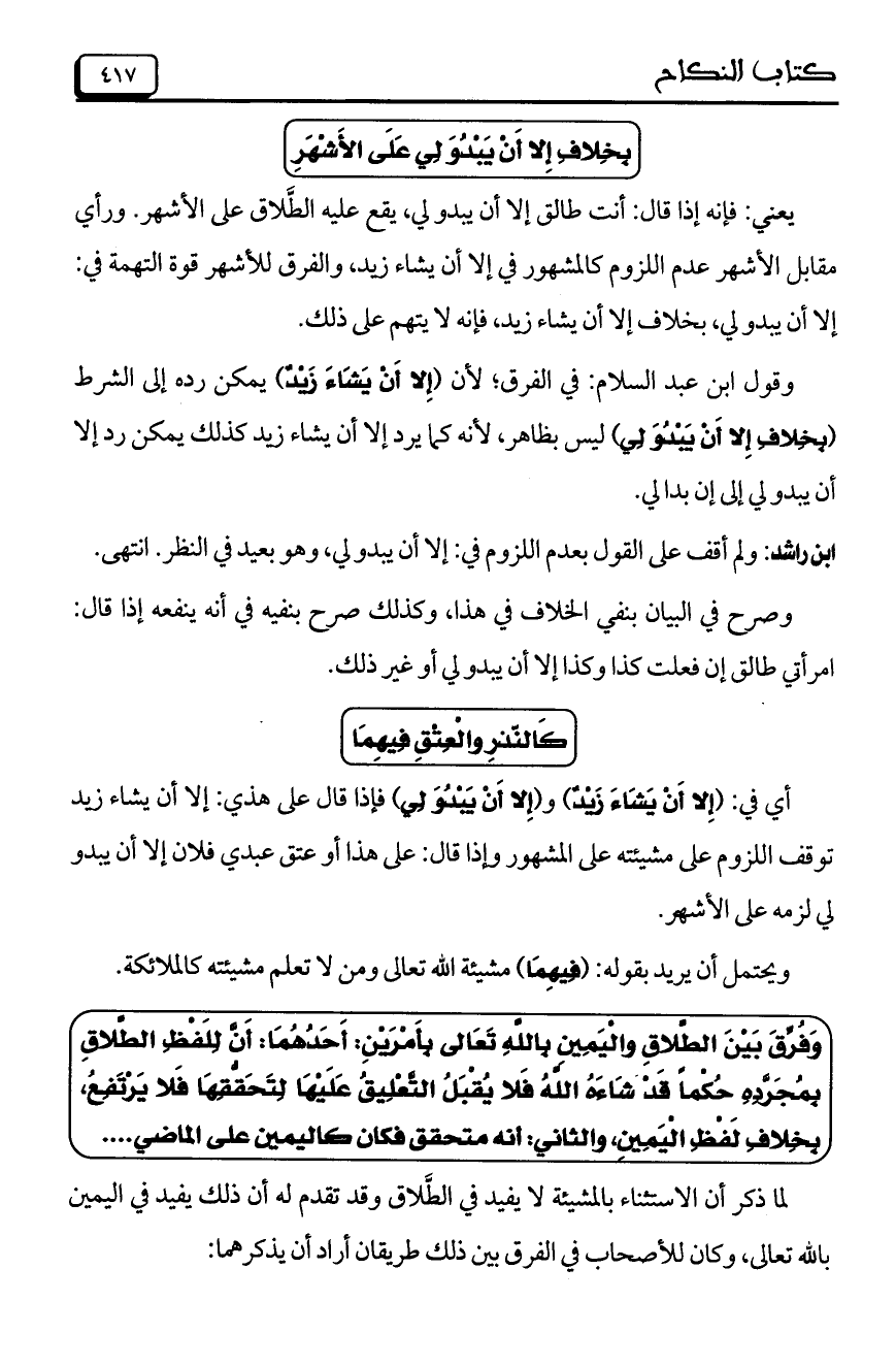 وقول ابن عبد السلام: في الفرق؛ لأن (إِلا أَنْ يَشَاءَ زَيْدُ) يمكن رده إلى الشرط (بِخِلافِ إِلا أَنْ يَبْدُوَ لِي) ليس بظاهر، لأنه كما يرد إلا أن يشاء زيد كذلك يمكن رد إلا أن يبدو لي إلى إن بدا لي.