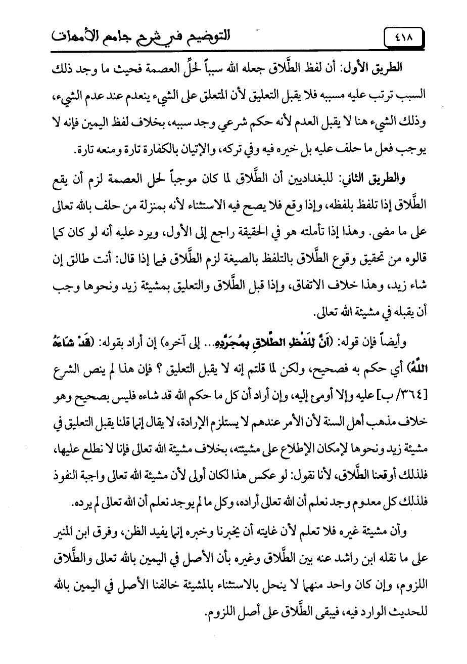والطريق الثاني: للبغداديين أن الطلاق لما كان موجباً لحل العصمة لزم أن يقع الطلاق إذا تلفظ بلفظه، وإذا وقع فلا يصح فيه الاستثناء لأنه بمنزلة من حلف بالله تعالى على ما مضى. وهذا إذا تأملته هو في الحقيقة راجع إلى الأول، ويرد عليه أنه لو كان كما قالوه من تحقيق وقوع الطلاق بالتلفظ بالصيغة لزما لطلاق فيما إذا قال: أنت طالق إن شاء زيد، وهذا خلاف الاتفاق، وإذا قبل الطلاق والتعليق بمشيئة زيد ونحوها وجب أن يقبله في مشيئة الله تعالى.