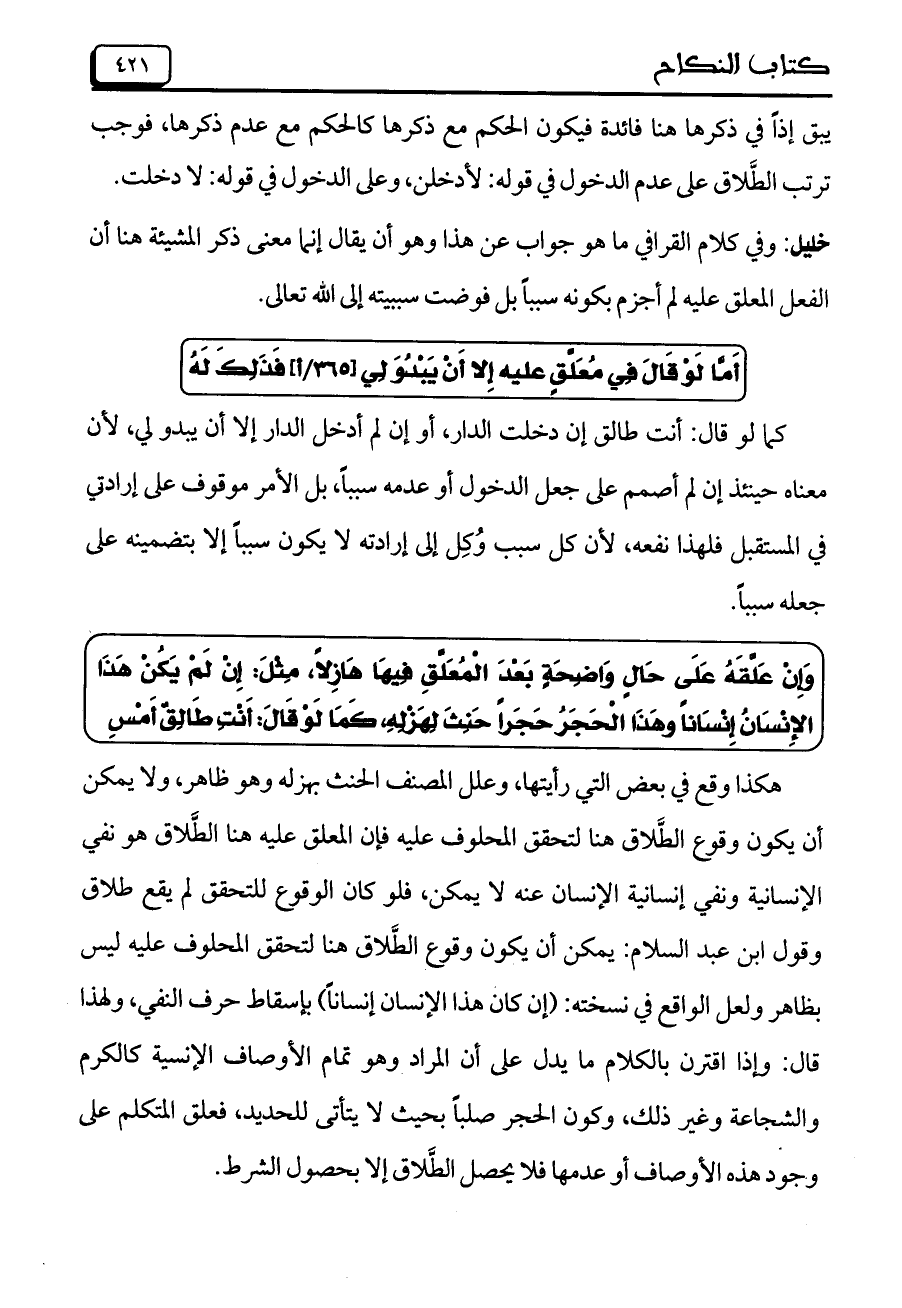 هكذا وقع في بعض التي رأيتها، وعلل المصنف الحنث بهزله وهو ظاهر، ولا يمكن أن يكون وقوع الطلاق هنا لتحقق المحلوف عليه فإن المعلق عليه هنا الطلاق هو نفي الإنسانية ونفي إنسانية الإنسان عنه لا يمكن، فلو كان الوقوع للتحقق لم يقع طلاق وقول ابن عبد السلام: يمكن أن يكون وقوع الطلاق هنا لتحقق المحلوف عليه ليس بظاهر ولعل الواقع في نسخته: (إن كان هذا الإنسان إنساناً) بإسقاط حرف النفي، ولهذا قال: وإذا اقترن بالكلام ما يدل على أن المراد وهو تمام الأوصاف الإنسية كالكرم والشجاعة وغير ذلك، وكون الحجر صلباً بحيث لا يتأتى للحديد، فعلق المتكلم على وجود هذه الأوصاف أو عدمها فلا يحصل الطلاق إلا بحصول الشرط.