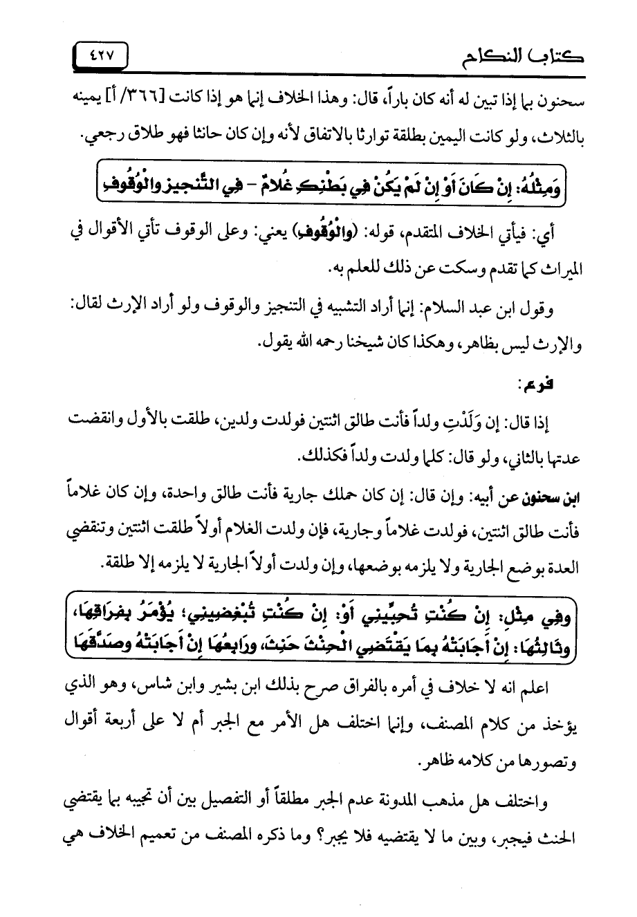 ابن سحنون عن أبيه: وإن قال: إن كان حملك جارية فأنت طالق واحدة، وإن كان غلاماً فأنت طالق اثنتين، فولدت غلاماً وجارية، فإن ولدت الغلام أولاً طلقت اثنتين وتنقضي العدة بوضع الجارية ولا يلزمه بوضعها، وإن ولدت أولاً الجارية لا يلزمه إلا طلقة.
