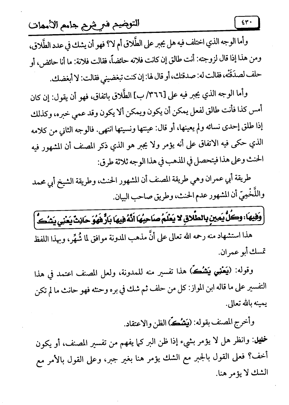 وَفِيهَا: وكُلُّ يَمِينٍ بِالطَّلاقِ لا يَعْلَمُ صَاحِبُهَا أَنَّهُ فِيهَا بَارُّ فَهُوَ حَانِثُ يَعْنِي يَشُكُّ