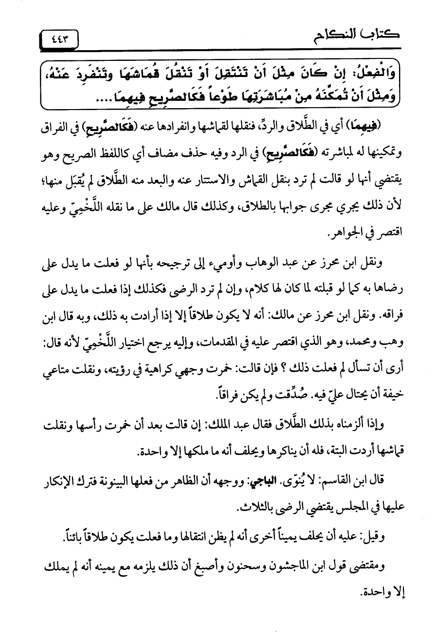 ونقل ابن محرز عن عبد الوهاب وأومئ إلى ترجيحه بأنها لو فعلت ما يدل على رضاها به كما لو قبلته لما كان لها كلام، وإن لم ترد الرضى فكذلك إذا فعلت ما يدل على فراقه. ونقل ابن محرز عن مالك: أنه لا يكون طلاقاً إلا إذا أرادت به ذلك، وبه قال ابن وهب ومحمد، وهو الذي اقتصر عليه في المقدمات، وإليه يرجع اختيار اللخمي لأنه قال: أرى أن تسأل لم فعلت ذلك؟ فإن قالت: خمرت وجهي كراهية في رؤيته، ونقلت متاعي خيفة أن يحتال علي فيه. صدقت ولم يكن فراقاً.
