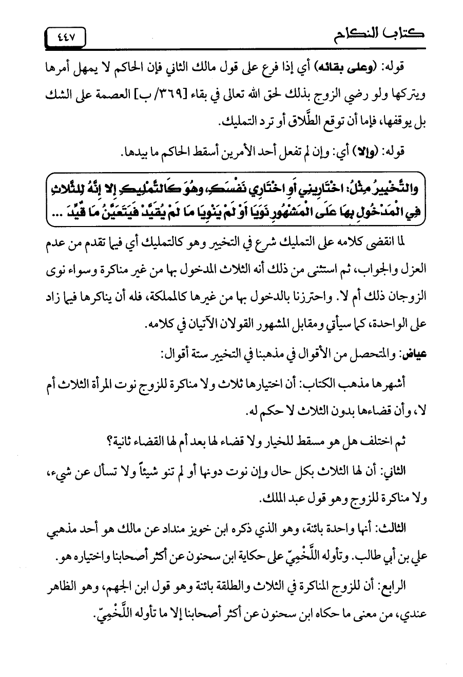 والتَّخْبِيرُ مِثْلُ: اخْتَارِينِي أَوِ اخْتَارِي نَفْسَكِ، وهُوَ كَالتَّمْلِيكِ إِلا إِنَّهُ لِلثَّلاثِ فِي الْمَدْخُولِ بِهَا عَلَى الْمَشْهُورِ نَوَيَا أَوْ لَمْ يَنْوِيَا مَا لَمْ يُقَيَّدْ فَيَتَعَيَّنُ مَا قُيِّدَ ..