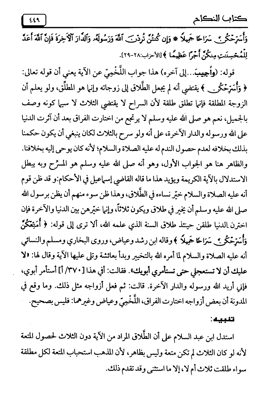 وَأُسَرِّحْكُنَّ سَرَاحاً جَمِيلاً* وَإِنْ كُنْتُنَّ تُرِدْنَ اللَّهَ وَرَسُولَهُ وَالدَّارَ الآخِرَةَ فَإِنَّ اللَّهَ أَعَدَّ لِلْمُحْسِنَاتِ مِنْكُنَّ أَجْراً عَظِيماً} [الأحزاب: 28 - 29].