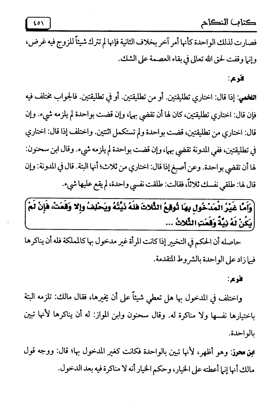 اللخمي: إذا قال: اختاري تطليقتين. أو من تطليقتين. أو في تطليقتين فالجواب مختلف فيه فإن قال: اختاري تطليقتين، كان لها أن تقضي بهما، وإن قضت بواحدة لم يلزمه شيء. وإن قال: اختاري من تطليقتين قضت بواحدة ولم تستكمل اثنتين. واختلف إذا قال: اختاري في تطليقتين ففي المدونة تقضي بهما، وإن قضت بواحدة لم يلزمه شيء. وقال ابن سحنون: لها أن تقضي بواحدة. وعن أصبغ إذا قال: اختاري من ثلاث؛ أنها البتة. قال في المدونة: وإن قال لها: طلقي نفسك ثلاثاً، فقالت: طلقت نفسي واحدة، لم يقع عليها شيء.