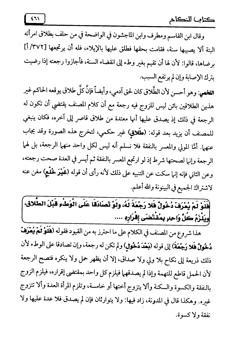 هذا شروع من المصنف في الكلام على ما احترز به من القيود فقوله (فَلَوْ لَمْ يُعْرَفْ دُخُولُ فَلا رَجْعَةَ) إلى قوله (بَعْدَ دُخُولٍ) ولم تكن له رجعة، وإن تصادقا على الوطء لأن ذلك ذريعة إلى نكاح بلا ولي ولا صداق، إلا أن يظهر حمل ولا ينكره فتصح الرجعة لأن الحمل قاطع للتهمة وإذا لم يصدقهما فيلزم كل واحد بمقتضى إقراره، فيلزم الزوج بالنفقة والكسوة والسكنة وألا يتزوج أختها أو خامسة، وتلزم المرأة العدة وألا تتزوج غيره. وهكذا قال في المدونة، زاد فيها: ولا يتوارثان فإن لم يصدق فلا عدة عليها ولا نفقة ولا كسوة.