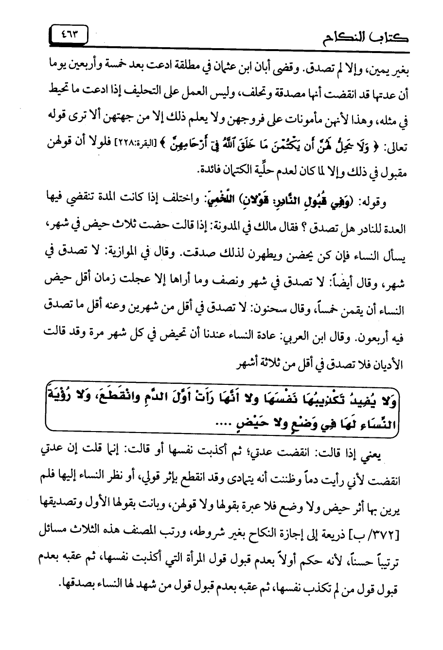 بغير يمين، وإلا لم تصدق. وقضى أبان ابن عثمان في مطلقة ادعت بعد خمسة وأربعين يوماً أن عدتها قد انقضت أنها مصدقة وتحلف، وليس العمل على التحليف إذا ادعت ما تحيط في مثله، وهذا لأنهن مأمونات على فروجهن ولا يعلم ذلك إلا من جهتهن ألا ترى قوله تعالى: (وَلا يَحِلُّ لَهُنَّ أَنْ يَكْتُمْنَ مَا خَلَقَ اللَّهُ فِي أَرْحَامِهِنَّ) [البقرة: 228] فلولا أن قولهن مقبول في ذلك وإلا لما كان لعدم حلية الكتمان فائدة.