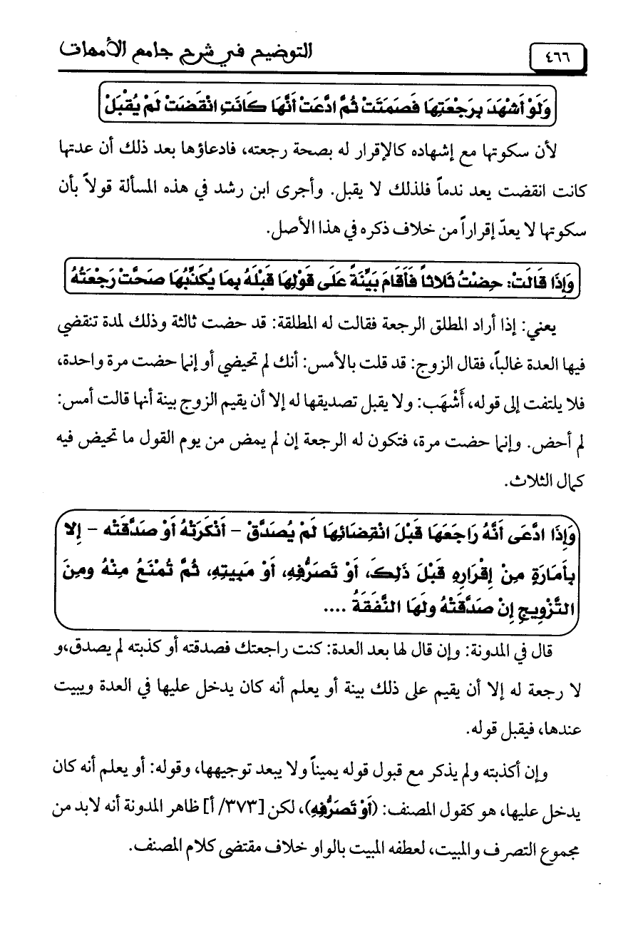 وَإِذَا ادَّعَى أَنَّهُ رَاجَعَهَا قَبْلَ انْقِضَائِهَا لَمْ يُصَدَّقْ- أَنْكَرَتْهُ أَوْ صَدَّقَتْه- إِلا بِأَمَارَةٍ مِنْ إِقْرَارِهِ قَبْلَ ذَلِكَ، أَوْ تَصَرُّفِهِ، أَوْ مَبِيتِهِ، ثُمَّ تُمْنَعُ مِنْهُ ومِنَ التَّزْوِيجِ إِنْ صَدَّقَتْهُ ولَهَا النَّفَقَةُ ..