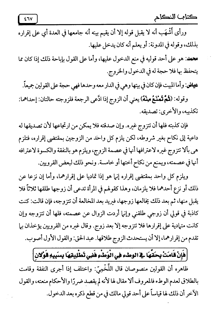 فإن كذبته فلها أن تتزوج غيره. وإن صدقته فلا يمكن من ارتجاعها لأن تصديقها له داعية إلى نكاح بغير شروطه، لكن يلزم كل واحد من الزوجين بمقتضى إقراره، فتلزم هي بألا تتزوج غيره لاعترافها أنها في عصمة الزوج، ويلزم هو بالنفقة والكسوة لاعترافه أنها في عصمته، ويمنع من نكاح أختها أو خامسة. ونحو ذلك لبعض القرويين.