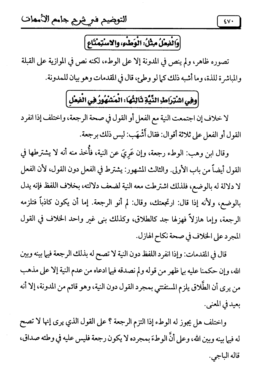 وقال ابن وهب: الوطء رجعة، وإن عري عن النية، فأخذ منه أنه لا يشترطها في القول أيضاً من باب الأولى. والثالث المشهور: يشترط في الفعل دون القول، لأن الفعل لا دلالة له بالوضع، فلذلك اشترطت معه النية لضعف دلالته، بخلاف اللفظ فإنه يدل بالوضع، ولأنه إذا قال: ارتجعتك، وقال: لم أنو الرجعة. إما أن يكون كاذباً فتلزمه الرجعة، وإما هازلاً فهزلها جد كالطلاق، وكذلك بنى غير واحد الخلاف في القول المجرد على الخلاف في صحة نكاح الهازل.