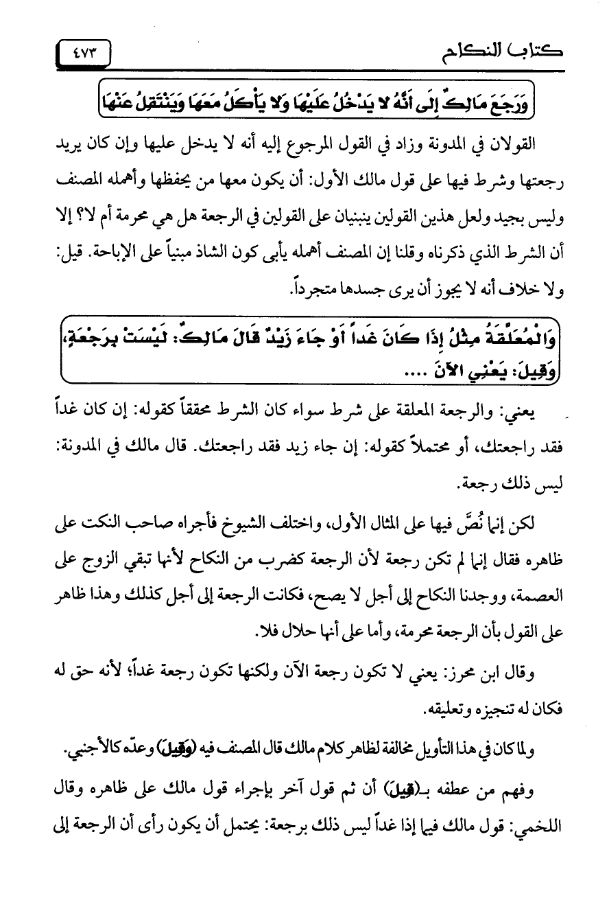 وَالْمُعَلَّقَةُ مِثْلُ إِذَا كَانَ غَداً أَوْ جَاءَ زَيْدُ قَالَ مَالِكُ: لَيْسَتْ بِرَجْعَةٍ، وَقِيلَ: يَعْنِي الآنَ ..