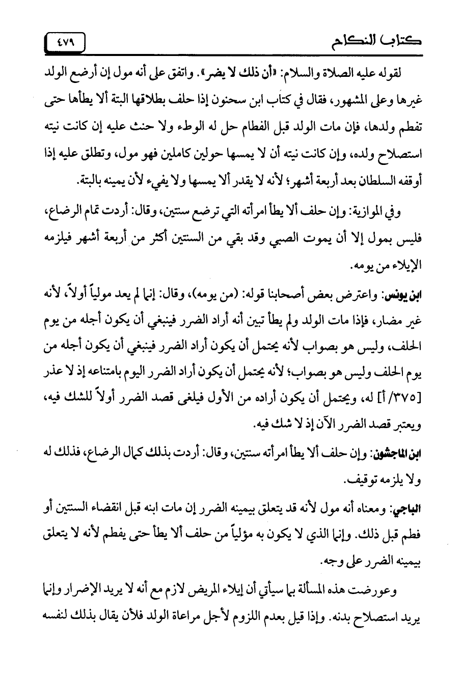 الباجي: ومعناه أنه مول لأنه قد يتعلق بيمينه الضرر إن مات ابنه قبل انقضاء السنتين أو فطم قبل ذلك. وإنما الذي لا يكون به مؤلياً من حلف ألا يطأ حتى يفطم لأنه لا يتعلق بيمينه الضرر على وجه.