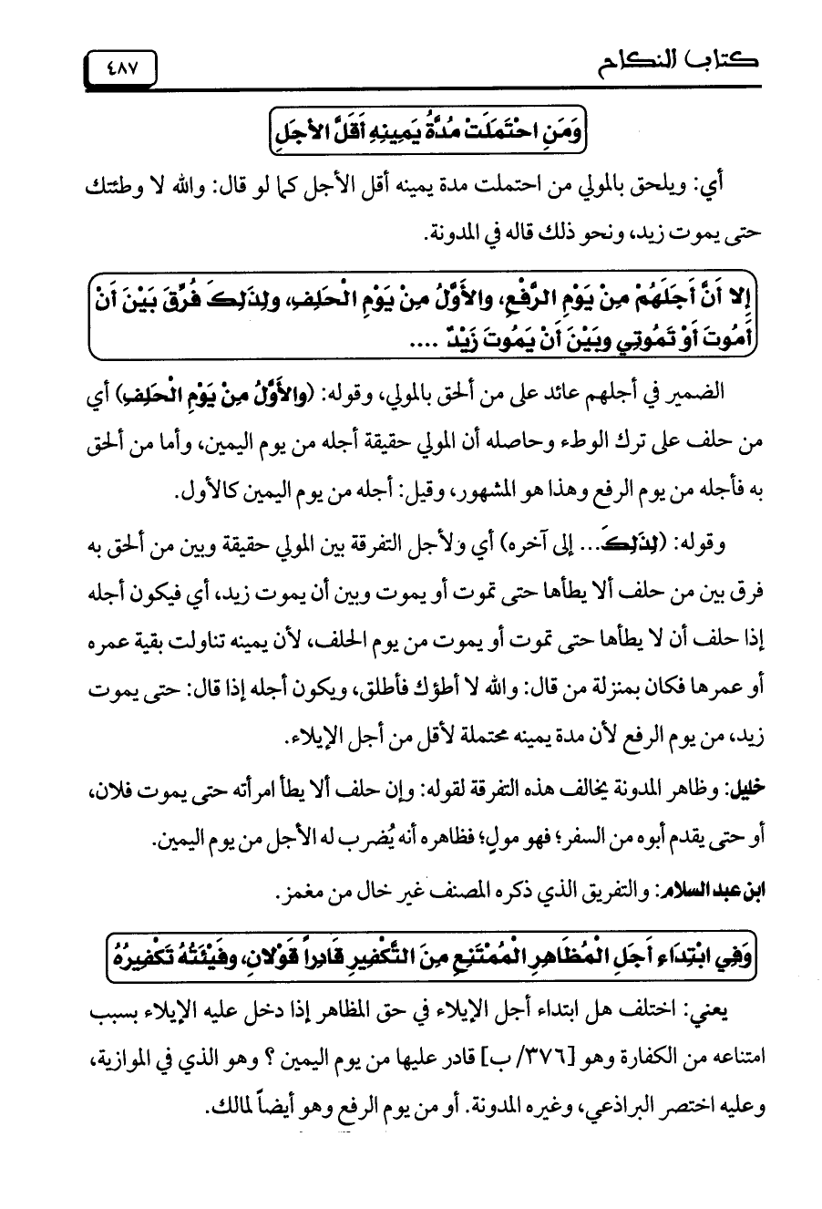 خليل: وظاهر المدونة يخالف هذه التفرقة لقوله: وإن حلف ألا يطأ امرأته حتى يموت فلان، أو حتى يقدم أبوه من السفر؛ فهو مول؛ فظاهره أنه يضرب له الأجل من يوم اليمين.