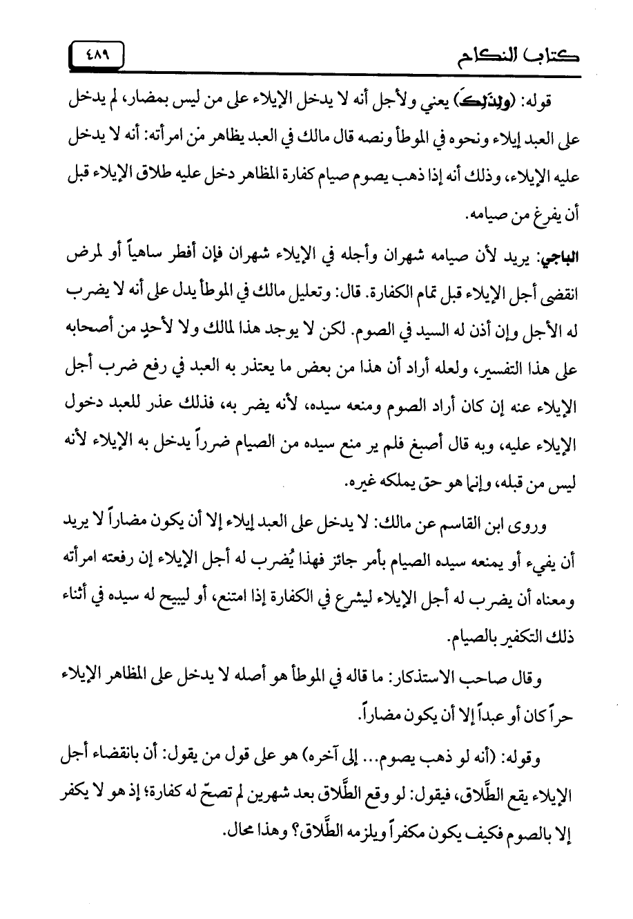الباجي: يريد لأن صيامه شهران وأجله في الإيلاء شهران فإن أفطر ساهياً أو لمرض انقضى أجل الإيلاء قبل تمام الكفارة. قال: وتعليل مالك في الموطأ يدل على أنه لا يضرب له الأجل وإن أذن له السيد في الصوم. لكن لا يوجد هذا لمالك ولا لأحدٍ من أصحابه على هذا التفسير، ولعله أراد أن هذا من بعض ما يعتذر به العبد في رفع ضرب أجل الإيلاء عنه إن كان أراد الصوم ومنعه سيده، لأنه يضر به، فذلك عذر للعبد دخول الإيلاء عليه، وبه قال أصبغ فلم ير منع سيده من الصيام ضرراً يدخل به الإيلاء لأنه ليس من قبله، وإنما هو حق يملكه غيره.