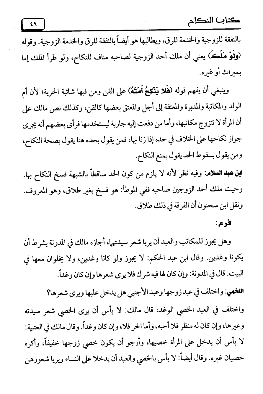 اللخمي: واختلف فى عبد زوجها وعبد الأجنبى هل يدخل عليها ويرى شعرها؟