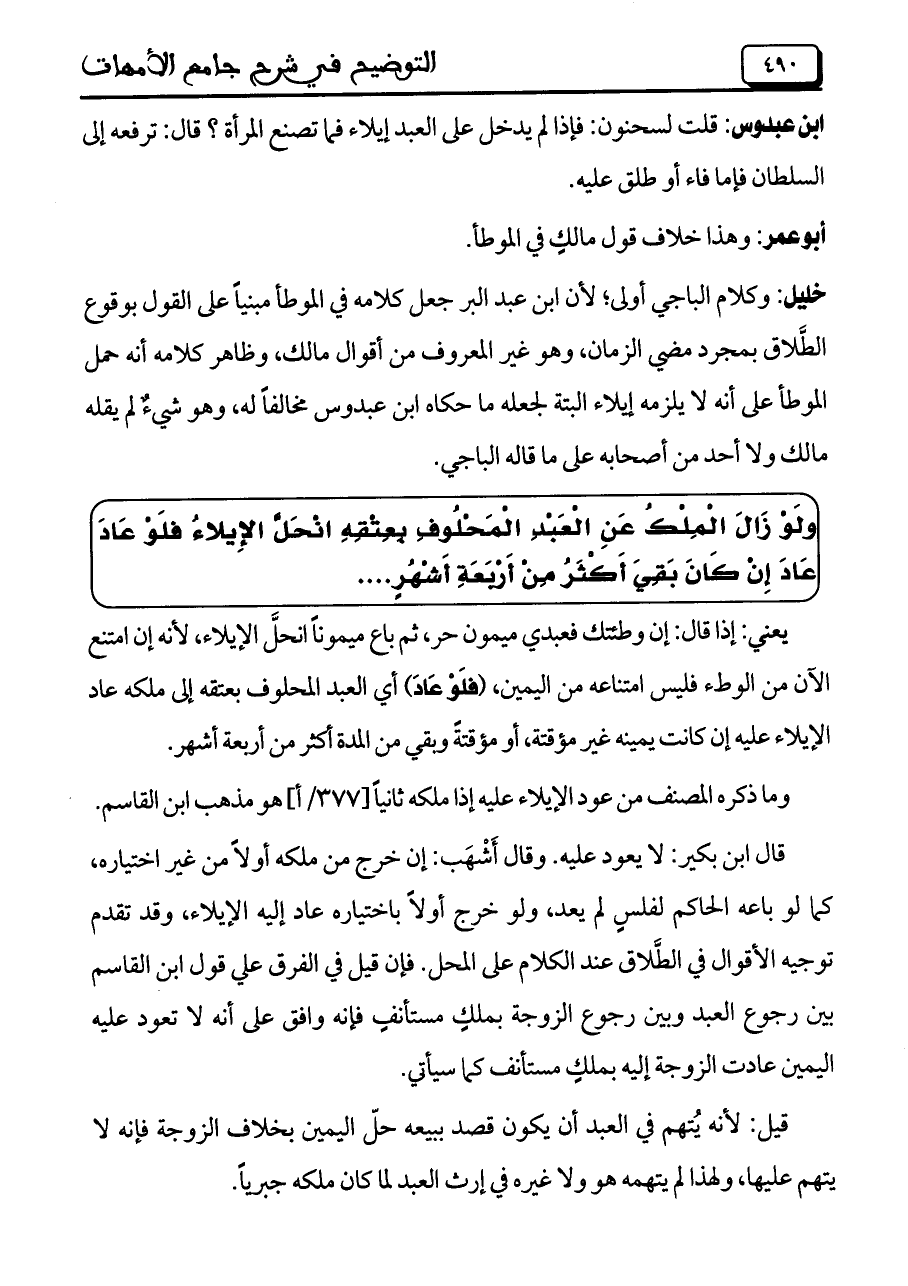خليل: وكلام الباجي أولى؛ لأن ابن عبد البر جعل كلامه في الموطأ مبنياً على القول بوقوع الطلاق بمجرد مضي الزمان، وهو غير المعروف من أقوال مالك، وظاهر كلامه أنه حمل الموطأ على أنه لا يلزمه إيلاء البتة لجعله ما حكاه ابن عبدوس مخالفاً له، وهو شيء لم يقله مالك ولا أحد من أصحابه على ما قاله الباجي.
