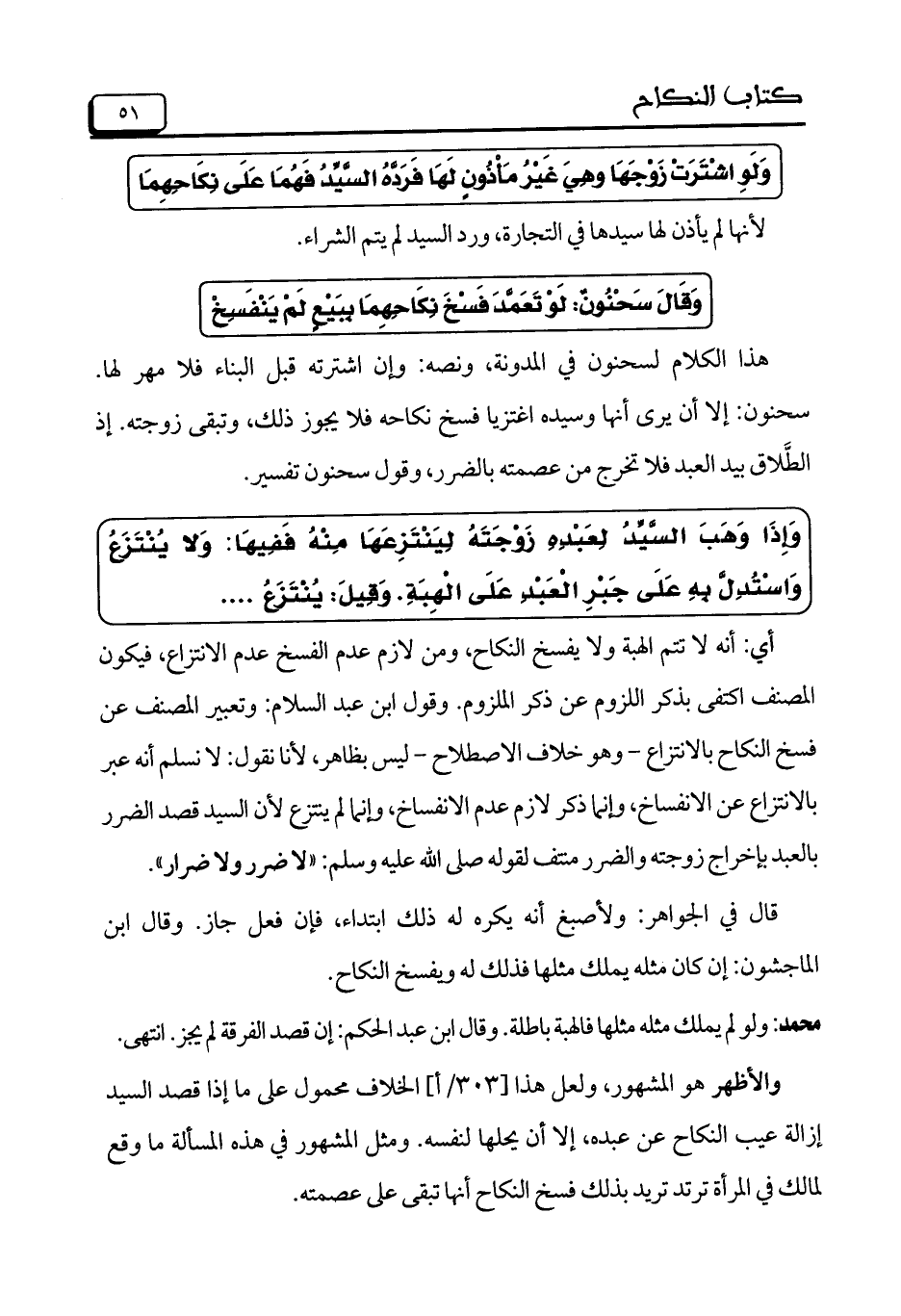 هذا الكلام لسحنون فى المدونة, ونصه: وإن اشترته قبل البناء فلا مهر لها. سحنون: إلا أن يرى أنها وسيده اغتزيا فسخ نكاحه فلا يجوز ذلك, وتبقى زوجته. إذ الطَّلاق بيد العبد فلا تخرج من عصمته بالضرر, وقول سحنون تفسير.