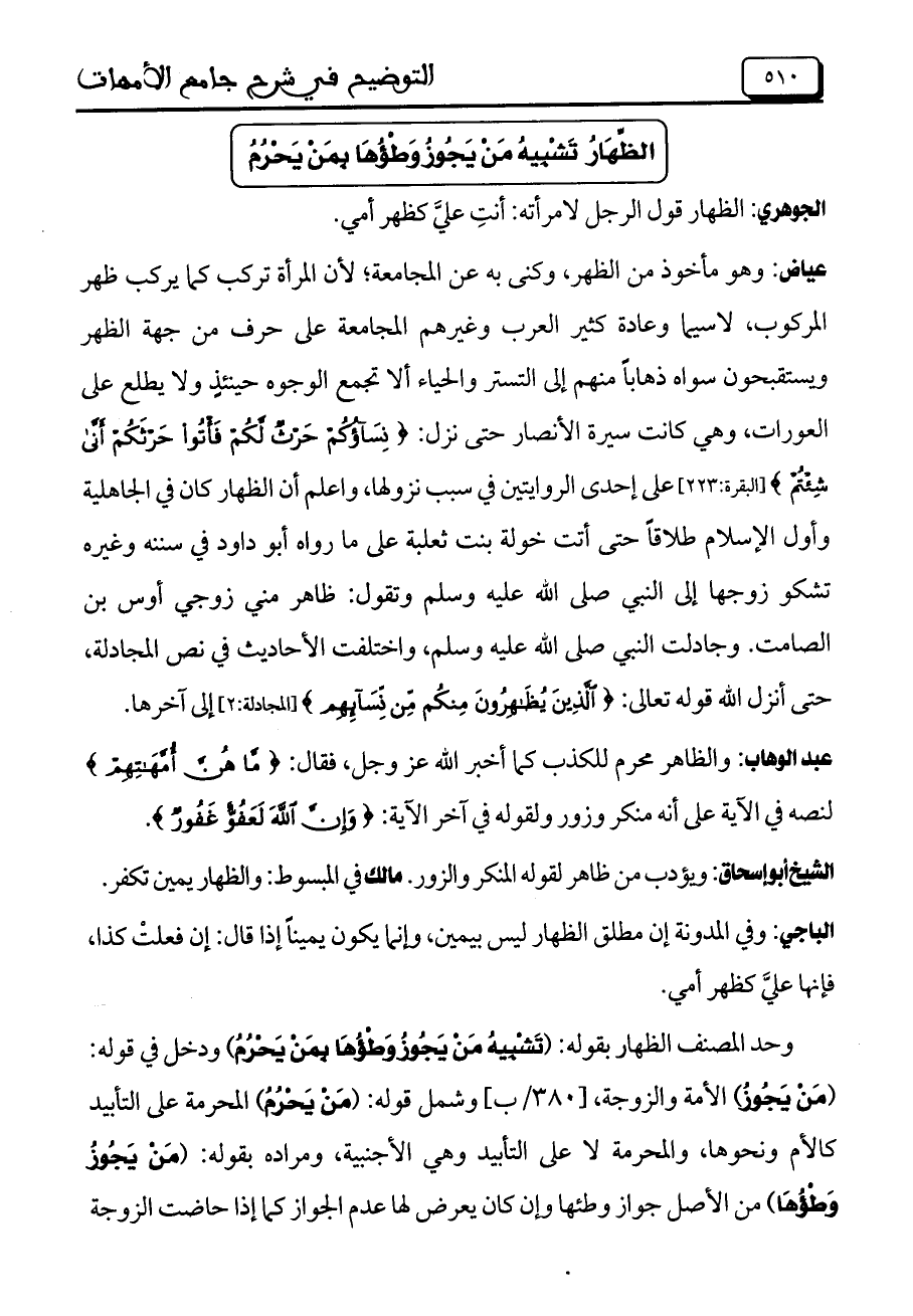 عياض: وهو مأخوذ من الظهر، وكنى به عن المجامعة؛ لأن المرأة تركب كما يركب ظهر المركوب، لاسيما وعادة كثير العرب وغيرهم المجامعة على حرف من جهة الظهر ويستقبحون سواه ذهاباً منهم إلى التستر والحياء ألا تجمع الوجوه حينئذٍ ولا يطلع على العورات، وهي كانت سيرة الأنصار حتى نزل: {نِسَاؤُكُمْ حَرْثٌ لَكُمْ فَاتُوا حَرْثَكُمْ أَنَّى شِئْتُمْ} [البقرة: 223] على إحدى الروايتين في سبب نزولها، واعلم أن الظهار كان في الجاهلية وأول الإسلام طلاقاً حتى أتت خولة بنت ثعلبة على ما رواه أبو داود في سننه وغيره تشكو زوجها إلى النبي صلى الله عليه وسلم وتقول: ظاهر مني زوجي أوس بن الصامت. وجادلت النبي صلى الله عليه وسلم، واختلفت الأحاديث في نص المجادلة، حتى أنزل الله قوله تعالى: {الَّذِينَ يُظَاهِرُونَ مِنْكُمْ مِنْ نِسَائِهِمْ} [المجادلة: 2] إلى آخرها.