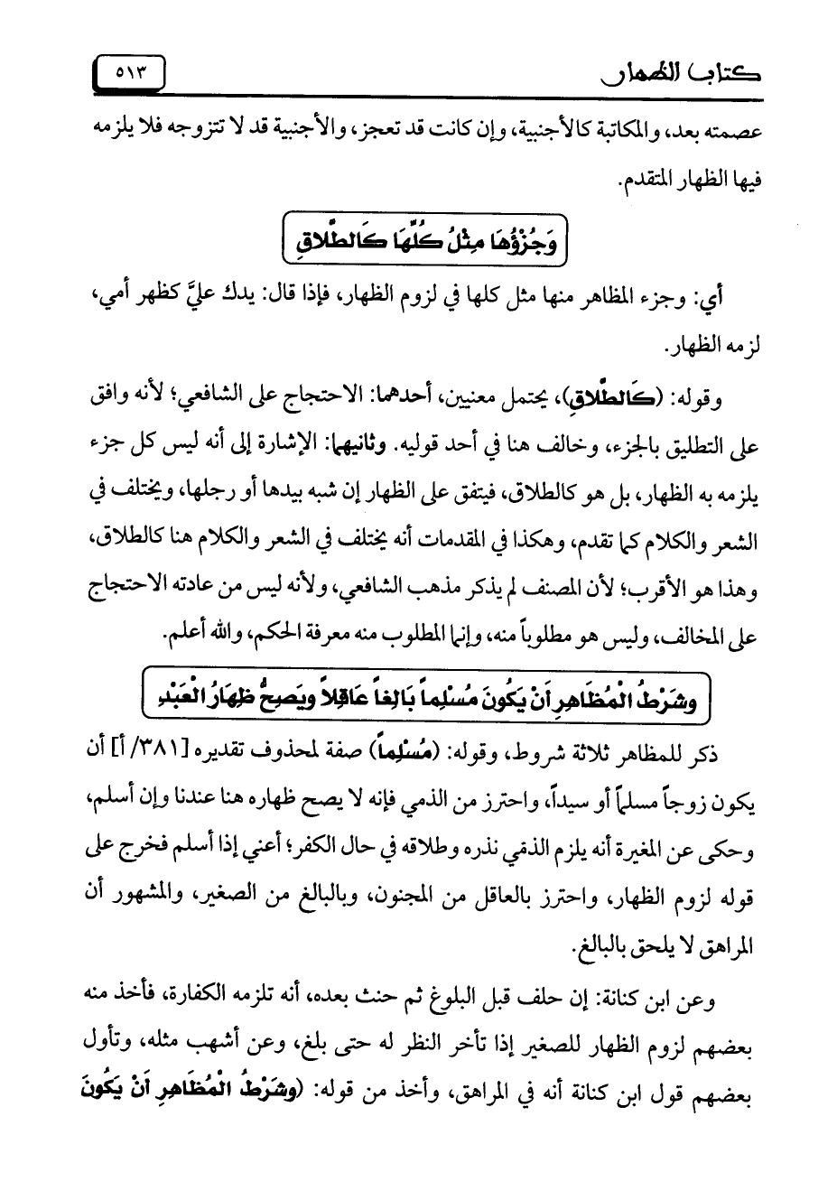 ذكر للمظاهر ثلاثة شروط، وقوله: (مُسْلِماً) صفة لمحذوف تقديره [381/أ] أن يكون زوجاً مسلماً أو سيداً، واحترز من الذمي فإنه لا يصح ظهاره هنا عندنا وإن أسلم، وحكى عن المغيرة أنه يلزم الذمي نذره وطلاقه في حال الكفر؛ أعني إذا أسلم فخرج على قوله لزوم الظهار، واحترز بالعاقل من المجنون، وبالبالغ من الصغيرن والمشهور أن المراهق لا يلحق بالبالغ.