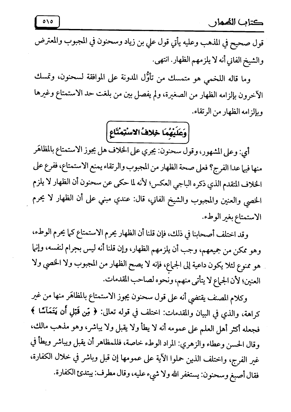وكلام المصنف يقتضي أنه على قول سحنون يجوز الاستمتاع بالمظاهَر منها من غير كراهة، والذي في البيان والمقدمات: اختلف في قوله تعالى: {مِنْ قَبْلِ أَنْ يَتَمَاسَّا} فجعله أكثر أهل العلم على عمومه أنه لا يطأ ولا يقبل ولا يباشر، وهو مذهب مالك، وقال الحسن وعطاء والزهري: المراد الوطء خاصة، فللمظاهر أن يقبل ويباشر ويطأ في غير الفرج، واختلف الذين حملوا الآية على عمومها إن قبل وباشر في خلال الكفارة، فقال أصبغ وسحنون: يستغفر الله ولا شيء عليه، وقال مطرف: يبتدئ الكفارة.