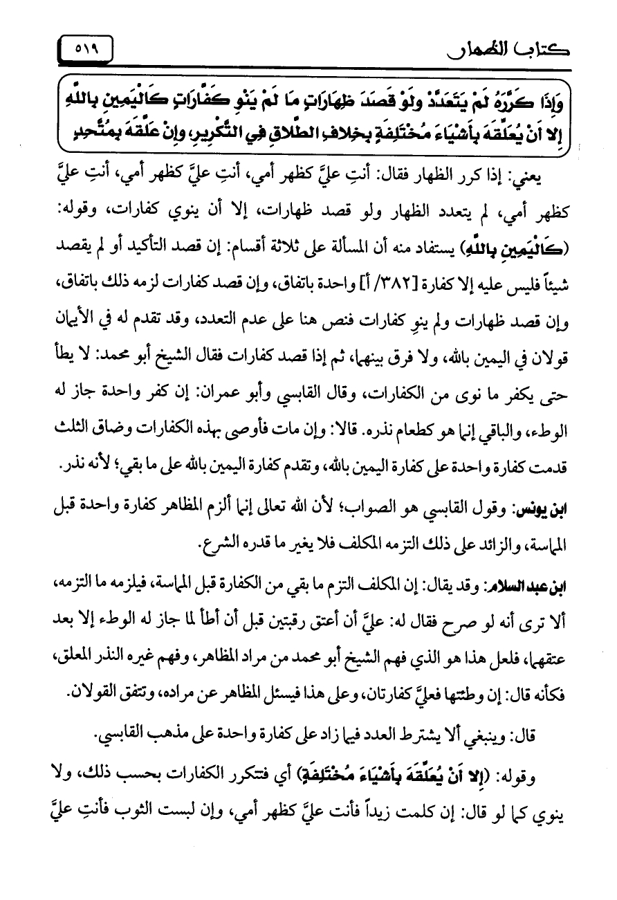 ابن عبد السلام: وقد يقال: إن المكلف التزم ما بقي من الكفارة قبل المماسة، فيلزمه ما التزمه، ألا ترى أنه لو صرح فقال له: عليَّ أن أعتق رقبتين قبل أن أطأ لما جاز له الوطء إلا بعد عتقهما، فلعل هذا هو الذي فهم الشيخ أبو محمد من مراد المظاهر، وفهم غيره النذر المعلق، فكأنه قال: إن وطئتها فعليَّ كفارتان، وعلى هذا فيسئل المظاهر عن مراده، وتتفق القولان.