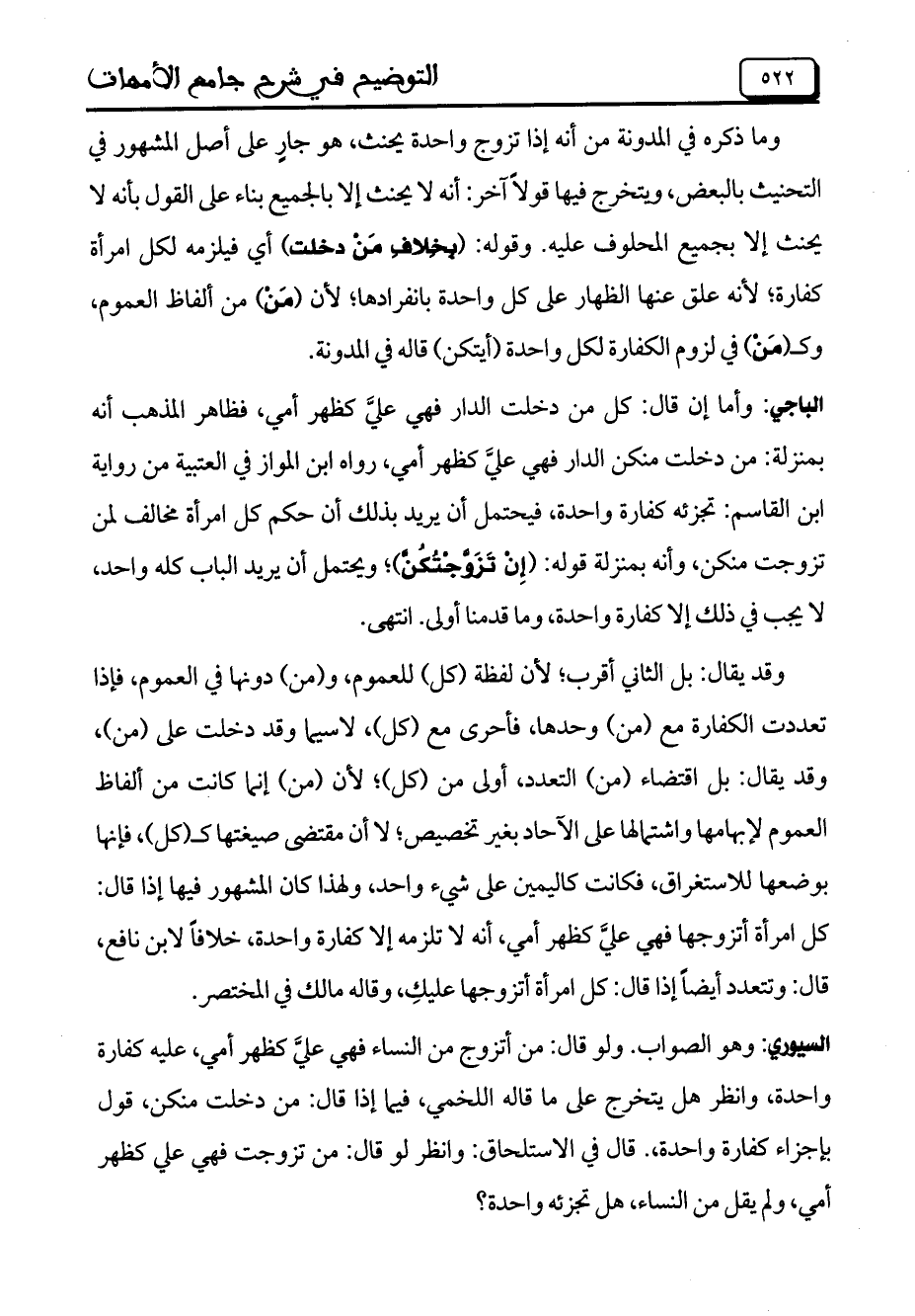 الباجي: وأما إن قال: كل من دخلت الدار فهي عليَّ كظهر أمي، فظاهر المذهب أنه بمنزلة: من دخلت منكن الدار فهي عليَّ كظهر أمي، رواه ابن المواز في العتبية من رواية ابن القاسم: تجزئه كفارة واحدة، فيحتمل أن يريد بذلك أن حكم كل امرأة مخالف لمن تزوجت منكن، وأنه بمنزلة قوله: (إِنْ تَزَوَّجْتُكُنَّ)؛ ويحتمل أن يريد الباب كله واحد، لا يجب في ذلك إلا كفارة واحدة، وما قدمنا أولى. انتهى.