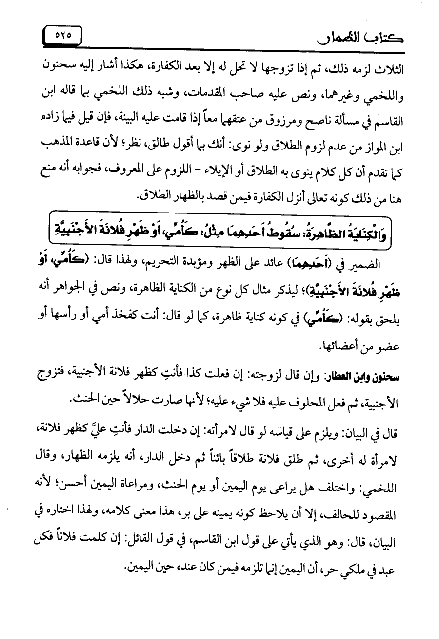 قال في البيان: ويلزم على قياسه لو قال لامرأته: إن دخلت الدار فأنتِ عليَّ كظهر فلانة، لامرأة له أخرى، ثم طلق فلانة طلاقاً بائناً ثم دخل الدار، أنه يلزمه الظهار، وقال اللخمي: واختلف هل يراعى يوم اليمين أو يوم الحنث، ومراعاة اليمين أحسن؛ لأنه المقصود للحالف، إلا أن يلاحظ كونه يمينه على بر، هذا معنى كلامه، ولهذا اختاره في البيان، قال: وهو الذي يأتي على قول ابن القاسم، في قول القائل: إن كلمت فلاناً فكل عبد في ملكي حر، أن اليمين إنما تلزمه فيمن كان عنده حين اليمين.