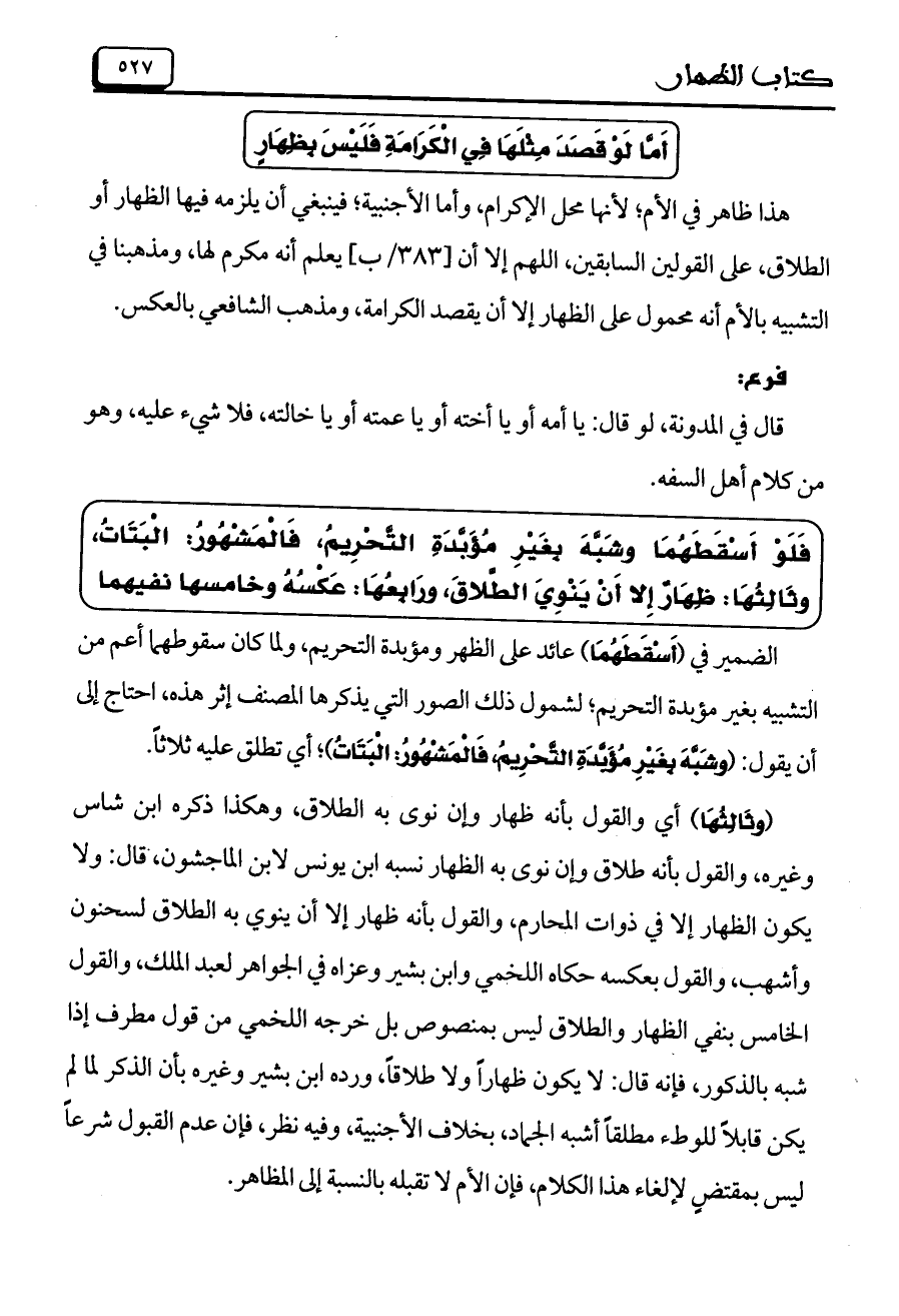 الضمير في (أَسْقَطَهُمَا) عائد على الظهر ومؤبدة التحريم، ولما كان سقوطهما أعم من التشبيه بغير مؤبدة التحريم؛ لشمول ذلك الصور التي يذكرها المصنف إثر هذه، احتاج إلى أن يقول: (وَشَبَّهَ بِغَيْرِ مُؤَبَّدَةِ التَّحْرِيمُ، فَالْمَشْهُورُ: الْبَتَاتُ)؛ أي تطلق عليه ثلاثاً.