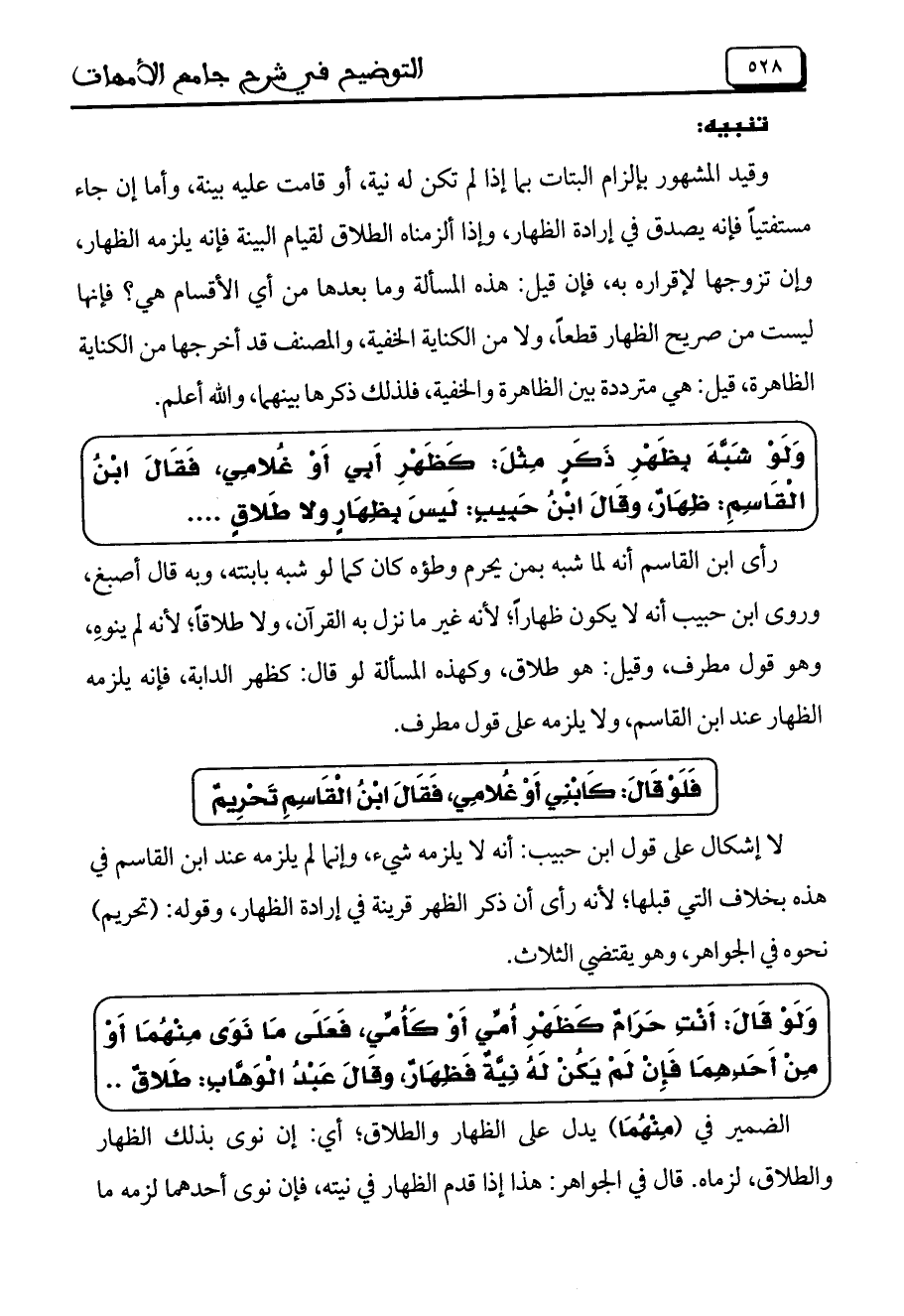وقيد المشهور بإلزام البتات بما إذا لم تكن له نية، أو قامت عليه بينة، وأما إن جاء مستفتياً فإنه يصدق في إرادة الظهار، وإذا ألزمناه الطلاق لقيام البينة فإنه يلزمه الظهار، وإن تزوجها لإقراره به، فإن قيل: هذه المسألة وما بعدها من أي الأقسام هي؟ فإنها ليست من صريح الظهار قطعاً، ولا من الكناية الخفية، والمصنف قد أخرجها من الكناية الظاهرة، قيل: هي مترددة بين الظاهرة والخفية، فلذلك ذكرها بينهما، والله أعلم.