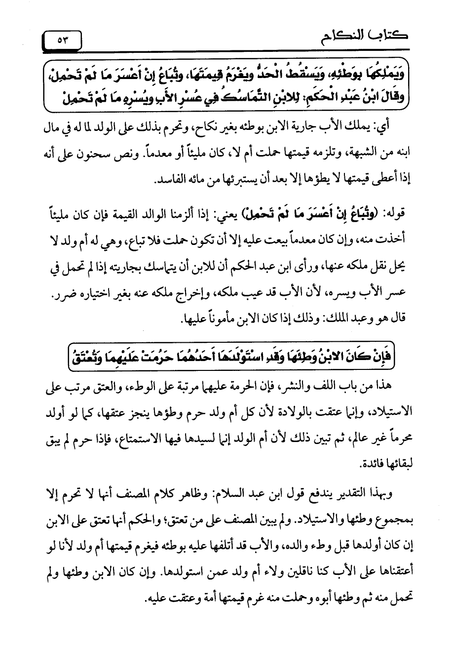 وَيَمْلِكُهَا بِوَطْئِهِ، وَيَسْقُطُ الْحَدُّ ويَغْرَمُ قِيمَتَهَا، وتُبَاعُ إِنْ أَعْسَرَ مَا لَمْ تَحْمِلْ، وقَالَ ابْنُ عَبْدِ الْحَكَمِ: لِلابْنِ التَّمَاسُكُ فِي عُسْرِ الأَبِ ويُسْرِهِ مَا لَمْ تَحْمِلْ