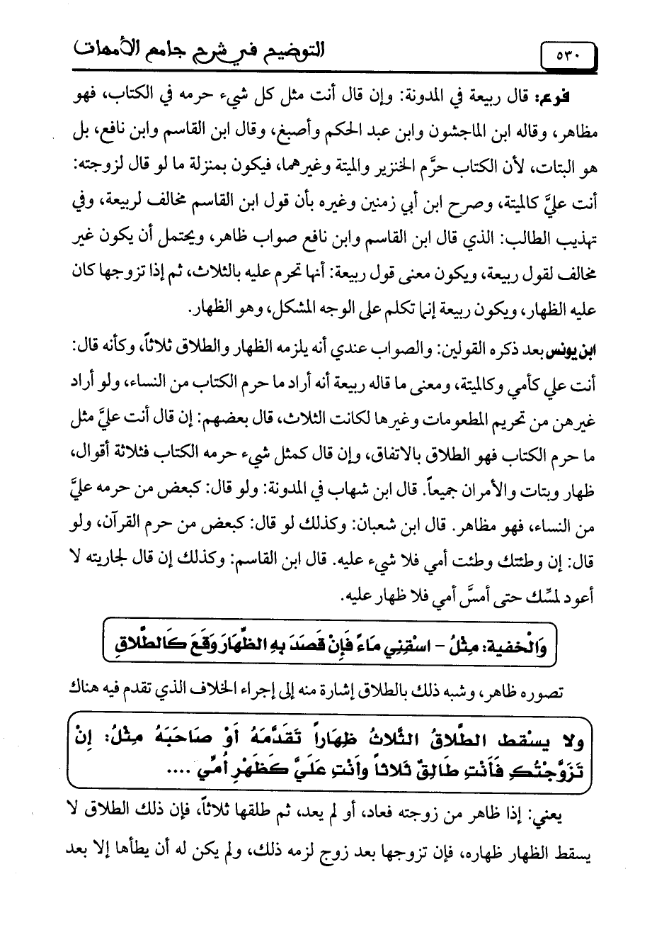 ابن يونس: بعد ذكره القولين: والصواب عندي أنه يلزمه الظهار والطلاق ثلاثاً، وكأنه قال: أنت علي كأمي وكالميتة، ومعنى ما قاله ربيعة أنه أراد ما حرم الكتاب من النساء، ولو أراد غيرهن من تحريم المطعومات وغيرها لكانت الثلاث، قال بعضهم: إن قال أنت عليَّ مثل ما حرم الكتاب فهو الطلاق بالاتفاق، وإن قال كمثل شيء حرمه الكتاب فثلاثة أقوال، ظهار وبتات والأمران جميعاً. قال ابن شهاب في املدونة: ولو قال: كبعض من حرمه عليَّ من النساء، فهو مظاهر. قال ابن شعبان: وكذلك لو قال: كبعض من حرم القرآن، ولو قال: إن وطئتك وطئت أمي فلا شيء عليه. قال ابن القاسم: وكذلك إن قال لجاريته لا أعود لمسِّك حتى أمسَّ أمي فلا ظهار عليه.
