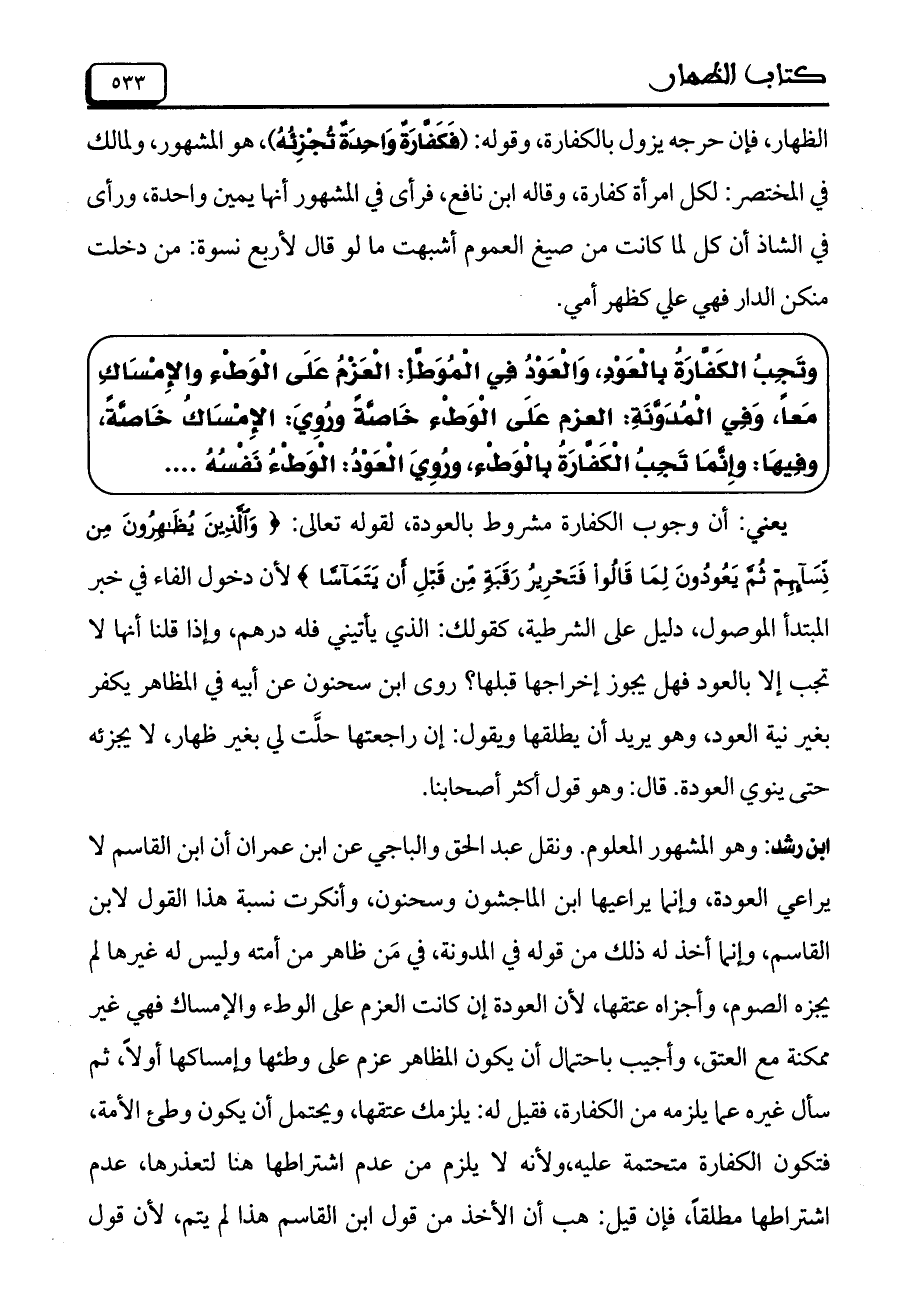 وَتَجِبُ الكَفَّارَةُ بِالْعَوْدِ، وَالْعَوْدُ فِي الْمُوَطَّأِ: الْعَزْمُ عَلَى الْوَطْءِ والإِمْسَاكِ مَعَاً، وَفِي الْمُدَوَّنَةِ: العزم عَلَى الْوَطْءِ خَاصَّةً ورُوِيَ: الإِمْسَاكُ خَاصَّةً، وَفِيهَا: وَإِنَّمَا تَجِبُ الْكَفَّارَةُ بِالْوَطْءِ، وَرُوِيَ الْعَوْدُ: الْوَطْءُ نَفْسُهُ ...