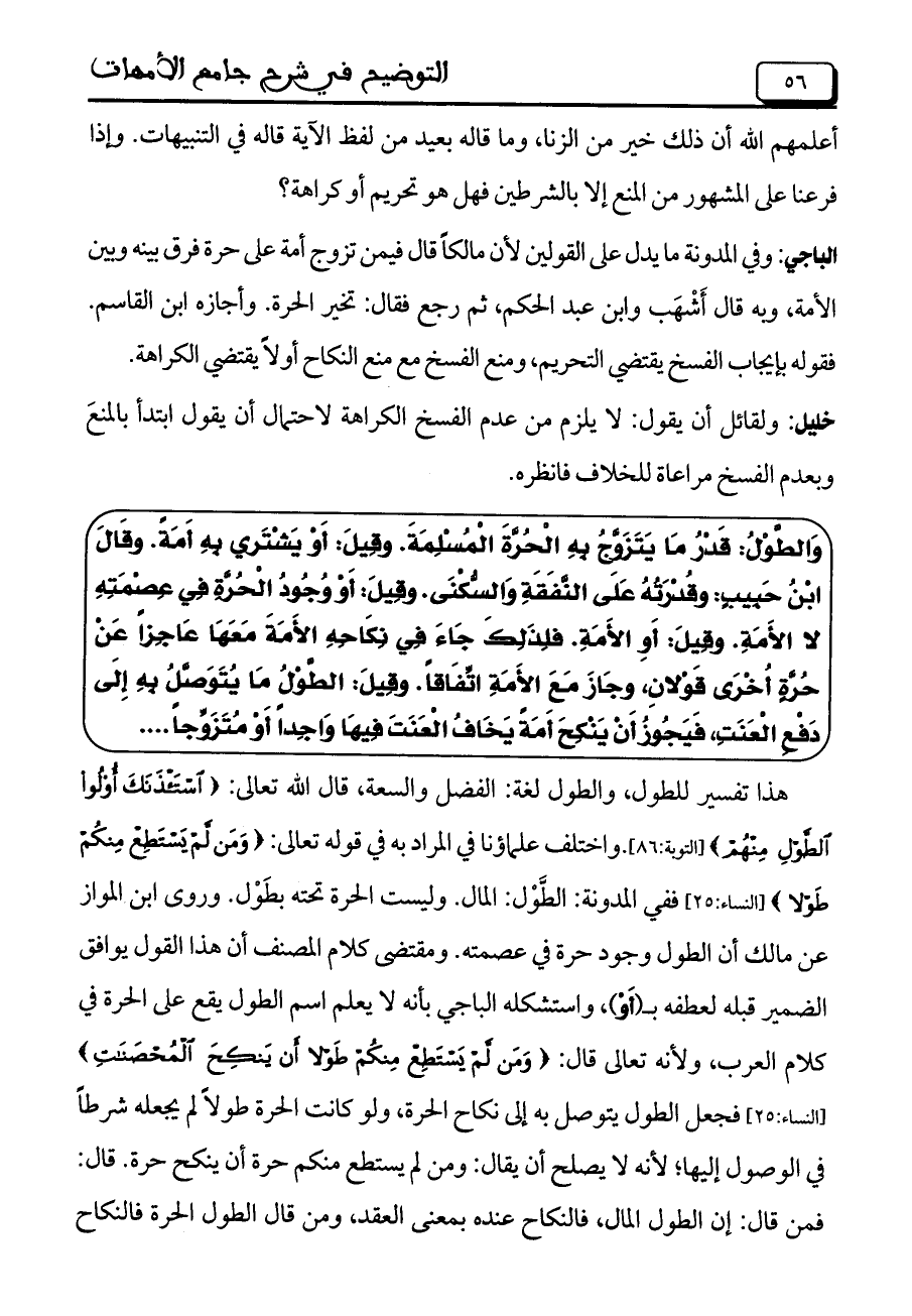 وَالطَّوْلُ: قَدْرُ مَا يَتَزَوَّجُ بِهِ الْحُرَّةَ الْمُسْلِمَةَ. وقِيلَ: أَوْ يَشْتَري بهِ أَمَةً. وَقَالَ ابْنُ حَبِيبٍ: وقُدْرَتُه عَلَى النَّفَقَةِ وَالسُّكْنَى. وَقِيلَ: أَوْ وُجُودُ الْحُرَّةِ فِي عِصْمَتِهِ لا الأَمَةِ. وقِيلَ: أَوِ الأَمَةِ. فلِذَلِكَ جَاءَ فِي نِكَاحِهِ الأَمَةَ مَعَهَا عَاجِراً عَنْ حُرَّةٍ أُخْرَى قَوْلانِ, وجَازَ مَعَ الأَمَةِ اتِّفَاقاً. وَقِيلَ: الطَّوْلُ مَا يُتَوَصَّلُ بِهِ إِلَى دَفْعِ الْعَنَتِ, فَيَجُوزُ أَنْ يَنْكِحَ أَمَةً يَخَافُ الْعَنَتَ فِيهَا وَاجِداً أَوْ مُتَزَوِّجاً .....