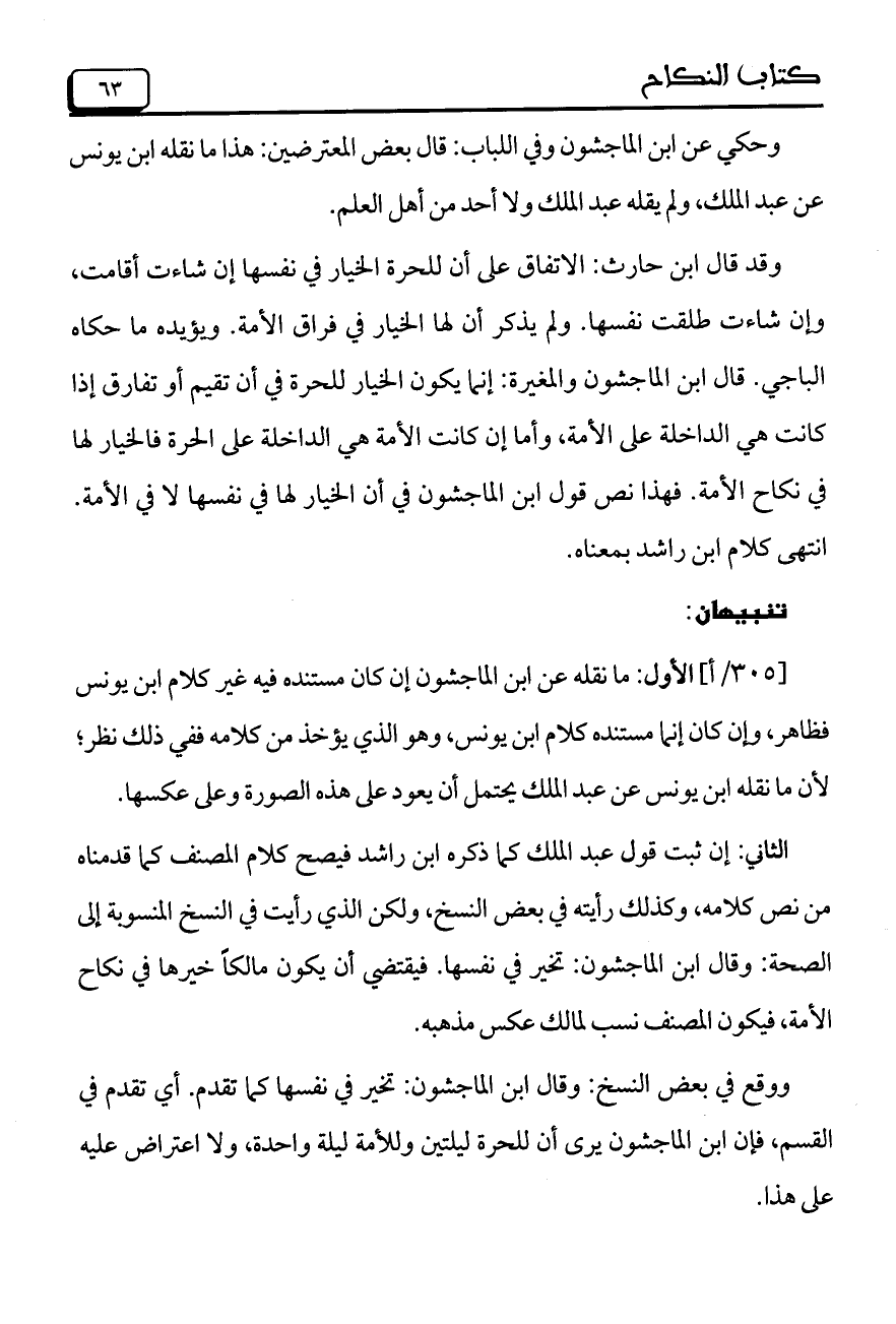 [305/أ] الأول: ما نقله عن ابن الماجشون إن كان مستنده فيه غير كلام ابن يونس فظاهر, وإن كان إنما مستنده كلام ابن يونس, وهو الذى يؤخذ من كلامه ففي ذلك نظر؛ لأن ما نقلة ابن يونس عن عبد الملك يحتمل أن يعود على هذه الصورة وعلى عكسها.