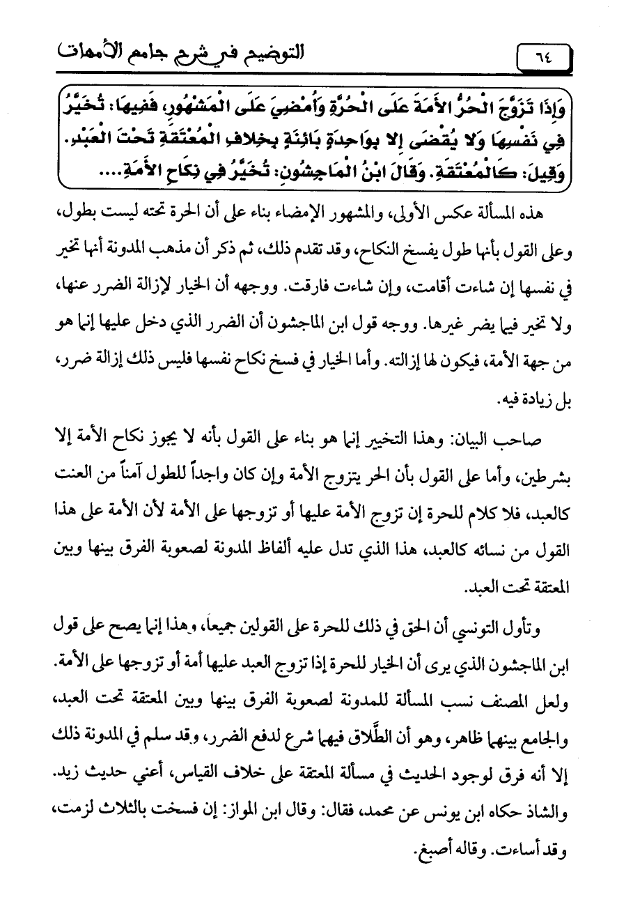 صاحب البيان: وهذا التخيير إنما هو بناء على القول بأنه لا يجوز نكاح الأمه إلا بشرطين, وأما على القول بأن الحر يتزوج الأمة وإن كان واجداً للطول آمناً من العنت كالعبد, فلا كلام للحرة إذا تزوج الأمة عليها أو تزوجها على الأمه لأن الأمة على هذا القول من نسائه كالعبد, هذا الذي تدل عليه ألفاظ المدونة لصعوبة الفرق بينها وبين المعتقة تحت العبد.