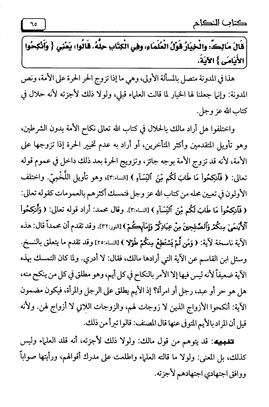 واختلفوا هل أراد مالك بالحلال في كتاب الله تعالى نكاح الأمة بدون الشرطين, وهو تأويل المتقدمين وأكثر المتأخرين, أو أراد به عدم تخبير الحرة إذا تزوجها على الأمة, لأنه قد تزوج الأمة بوجه جائز, وتزويج الحرة بعد ذلك داخل في عموم قوله تعالى: {فَانكِحُوا مَا طَابَ لَكُمْ مِنَ النِّسَاءِ} [النساء: 3] وهو تأويل اللَّخْمِيّ. واختلف الأولون في تعيين محله من كتاب الله عز وجل فتمسك أكثرهم بالعمومات كقوله تعالى: {فَانكِحُوا مَا طَابَ لَكُمْ مِنَ النِّسَاءِ} [النساء: 3]. وقال محمد: أراد قوله تعالى: {وَأَنكِحُوا الأَيَامَى مِنْكُمْ وَالصَّالِحِينَ مِنْ عِبَادِكُمْ وَإِمَائِكُمْ} [النور: 32]. وقد تقدم أن محمداً قال: هذه الآية ناسخة لآية: {وَمَنْ لَمْ يَسْتَطِعْ مِنْكُمْ طَوْلاً} [النساء: 25] وقد تقدم ما يتعلق بالنسخ. وسئل ابن القاسم عن الآية التي أرادها مالك, فقال: لا أدري. ولما كان التمسك بهذه الآية ضعيفاً لأنه ليس فيها إلا الأمر بالنكاح في كل أيم, وهو مطلق في كل من ينكح منه, هل هو حر أو عبد, أو امرأة؟ إذ الأيم يطلق على الرجل والمرأة, فيكون مضمون الآية: أنكحوا الأزواج الذين لا زوجات لهم, والزوجات اللاتي لا أزواج لهن. ولأنه قيل أن المراد بالأيم المتوفى عنها قال المصنف: قالوا تبرأمن ذلك.