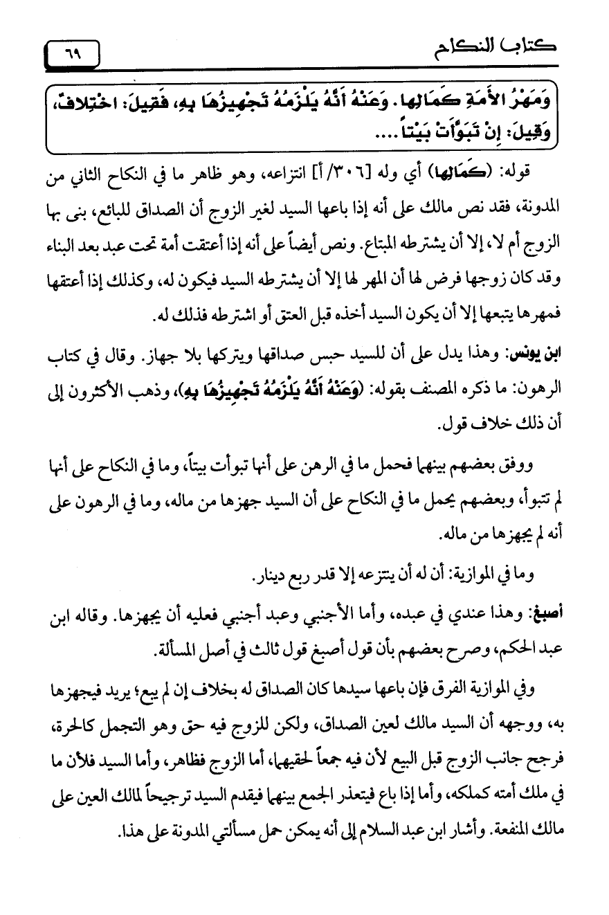 ابن يونس: وهذا يدل على أن للسيد حبس صدقاها ويتركها بلا جهاز. وقال في كتاب الرهون: ما ذكره المصنف بقوله: (وَعَنْهُ أَنَّهُ يَلْزَمُهُ تَجْهِيزُهَا بِهِ)، وذهب الأكثرون إلى أن ذلك خلاف قول.