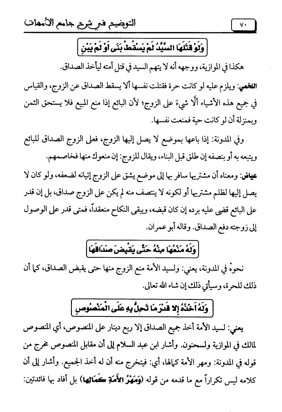 نحوه في المدونة، يعني: ولسيد الأمة منع الزوج منها حتى يقبض الصداق، كما أن ذلك للحرة، وسيأتي ذلك إن شاء الله تعالى.