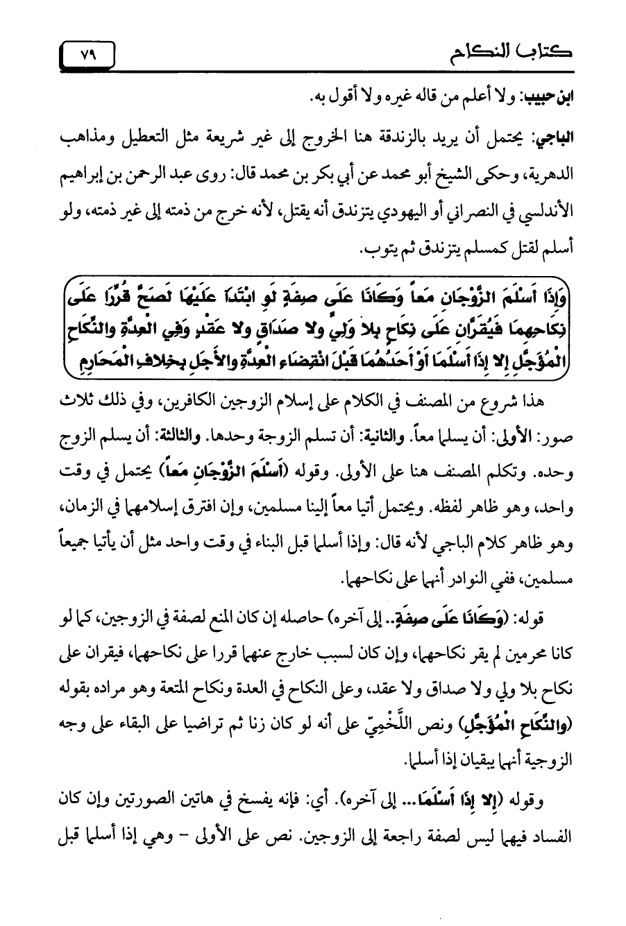 هذا شرع من المصنف في الكلام على إسلام الزوجين الكافرين، وفي ذلك ثلاث صور: الأولى: أن يسلما معاً. والثانية: أن تسلم الزوجة وحدها. والثالثة: أن يسلم الزوج وحده. وتكلم المصنف هنا على الأولى. وقوله (أَسْلَمَ الزَّوْجَانِ مَعاً) يحتمل في وقت واحد، وهو ظاهر لفظه. ويحتمل أتيا معاً إلينا مسلمين، وإن افترق إسلامهما في الزمان، وهو ظاهر كلام الباجي لأنه قال: وإذا أسلما قبل البناء في وقت واحد مثل أن يأتيا جميعاً مسلمين، ففي النوادر أنهما على نكاحهما.
