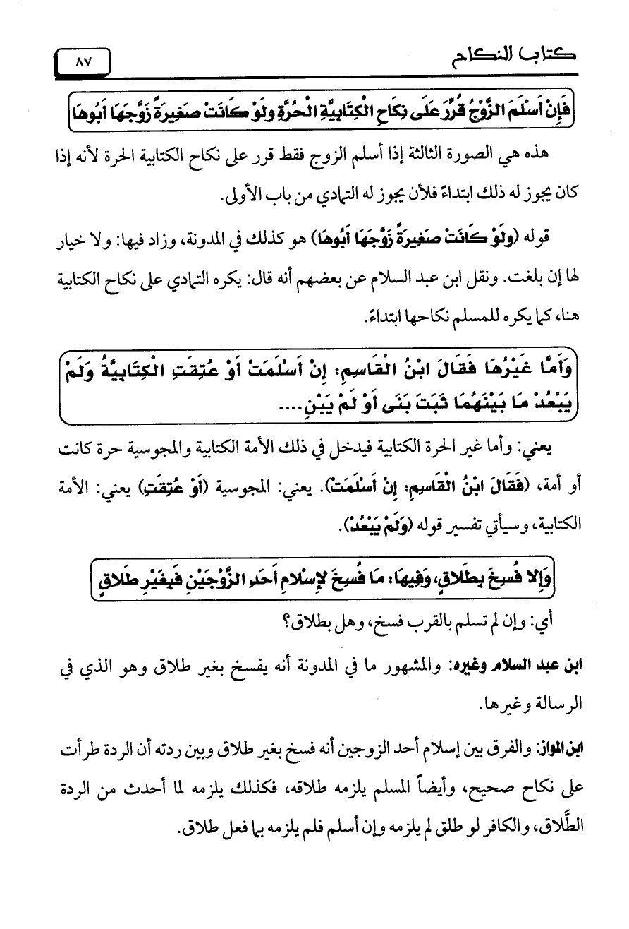 هذه هي الصورة الثالثة إذا أسلم الزوج فقط قرر عل نكاح الكتابية الحرة لأنه إذا كان يجوز له ذلك ابتداءً فلأن يجوز له التمادي من باب الأولى.