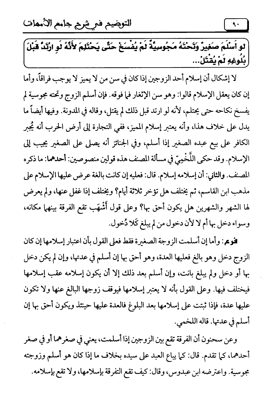 لا إشكال أن إسلام أحد الزوجين إذا كان في سن من لا يميز لا يوجب فراقاً، وأما إن كان يعقل الإسلام قالوا؛ وهو من الإثغار فما فوقه. فإن أسلم الزوج وتحته مجوسية لم يفسخ نكاحه حتى يحتلم، لأنه لو ارتد قبل ذلك لم يقتل، وقاله في المدونة. وفيها أيضاً ما يدل عل خلاف هذا، وأنه يعم إسلام المميز، ففي التجارة إلى أرض الحرب أنه يُجبر الكافر عل بيع عبده الصغير إذا أسلم، وفي الجنائز أنه يصل على الصغير يجيب إلى الإسلام. وقد حكى اللَّخْمِيّ في مسألة المصحف هذه قولين منصوصين: أحدهما: ما ذكره المصنف. والثاني: أن إسلامه إسلام. قال: فعليه إن كانت بالغة عرض عليها الإسلام على مذهب ابن القاسم، ثم يختلف هل تؤخر ثلاثة أيام؟ ويختلف إذا غفل عنها، ولم يعرض لها الشهر والشهرين هل يكون أحق بها؟ وعلى قول أشهب تقع الفرقة بينها مكانه، وسواء دخل بها أم لا لأن دخول من لم يبلغ كَلا دُخول.