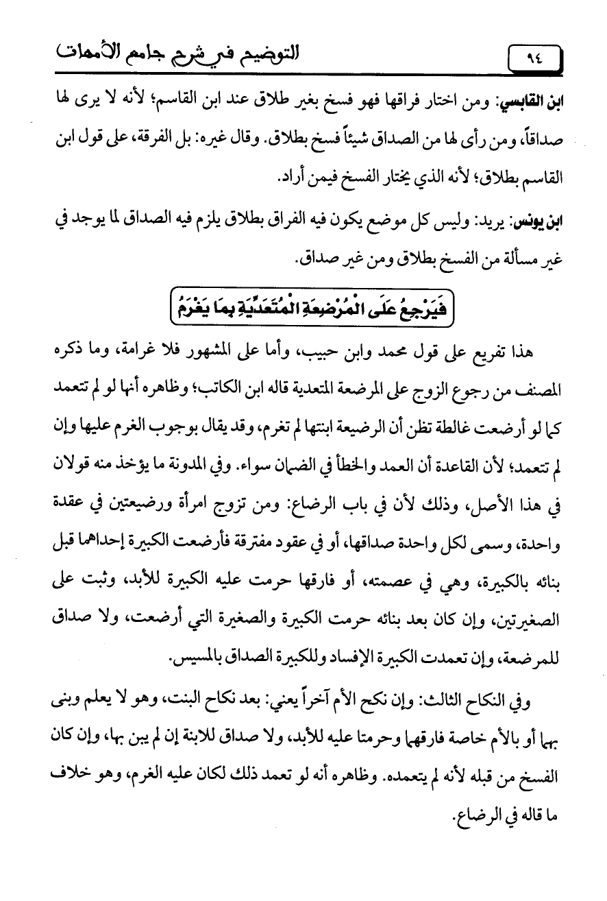 ابن يونس: يريد: وليس كل موضح يكون فيه الفراق بطلاق يلزم فيه الصداق لما يوجد في غير مسألة من الفسخ بطلاق ومن غير صداق.