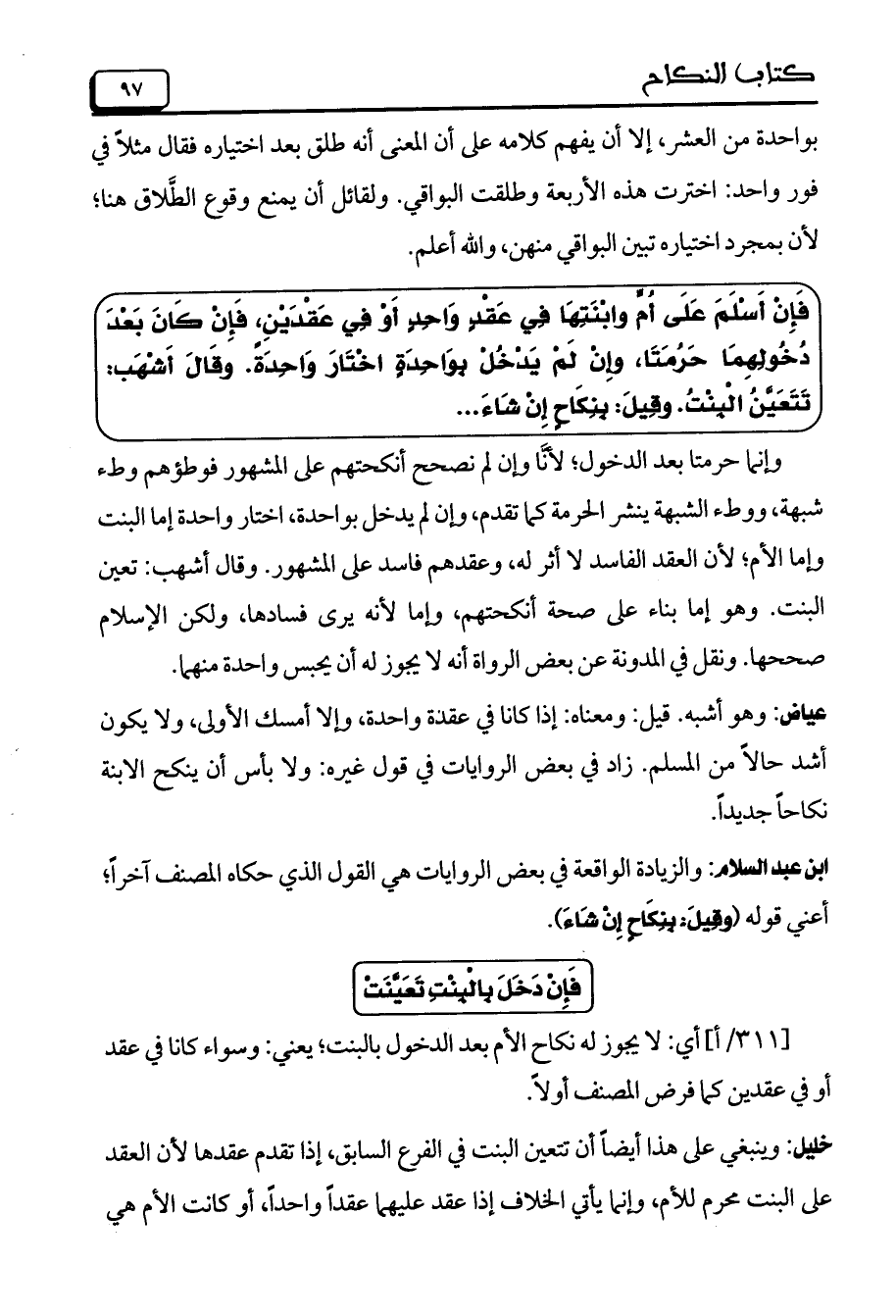 ابن عبد السلام: والزيادة الواقعة في بعض الروايات هي القول الذي حكاه المصنف آخراً؛ أعني قوله (وقِيلَ: بِنِكَاحٍ إِنْ شَاءَ).