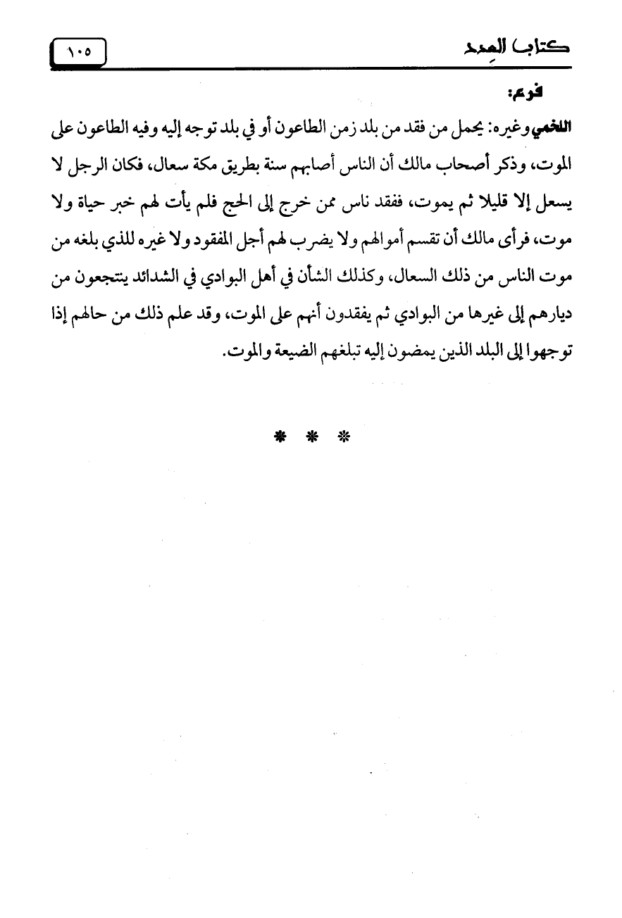 اللخمي وغيره: يحمل من فقد من بلد زمن الطاعون أو في بلد توجه إليه وفيه الطاعون على الموت، وذكر أصحاب مالك أن الناس أصابهم سنة بطريق مكة سعال، فكان الرجل لا يسعل إلا قليلا ثم يموت، ففقد ناس ممن خرج إلى الحج فلم يأت لهم خبر حياة ولا موت، فرأى مالك أن تقسم أموالهم ولا يضرب لهم أجل المفقود ولا غيره للذي بلغه من موت الناس من ذلك السعال، وكذلك الشأن في أهل البوادي في الشدائد ينتجعون من ديارهم إلى غيرها من البوادي ثم يفقدون أنهم على الموت، وقد علم ذلك من حالهم إذا توجهوا إلى البلد الذين يمضون إليه تبلغهم الضيعة والموت.